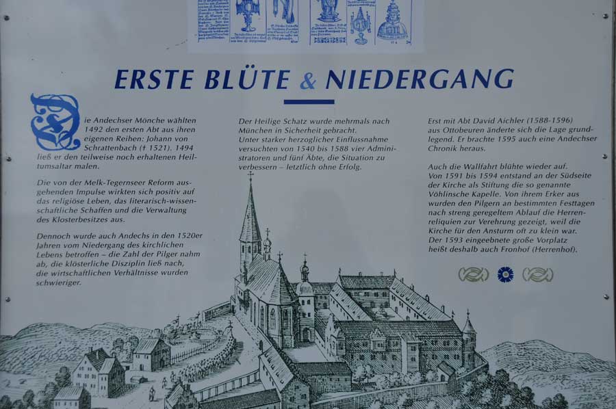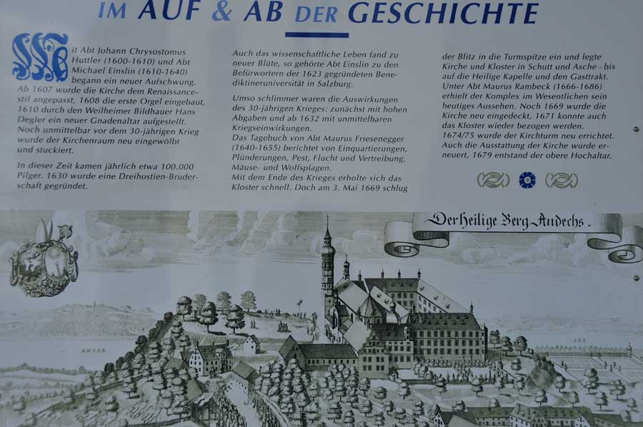 Am Weg weisen einige Schautafeln auf das Auf und Ab in der langen Klostergeschichte hin, so dass auch der weniger kundige Besucher über grundlegende Informationen zur kirchlichen Entwicklungsgeschichte des Klosters verfügt, so er denn die Schautafeln liest und sich nicht auf direktem Weg hinein in das Bräustüberl verirrt. Die Schautafeln weisen auf Details von der Entstehung des Klosters, den entsetzlichen, religiösen Glaubenskriegen im Mittelalter (die sich leider bis in die Moderne fortsetzen) und von bedeutenden Persönlichkeiten der Klosterkirche hin, so erhält der Besucher zumindest einen groben Überblick.