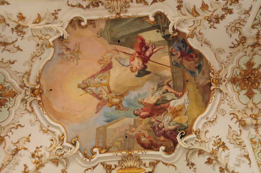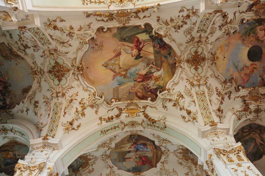 Die vier Deckenfresken Johann Baptist Zimmermanns im Hauptschiff zeigen den „Andechser Heiligenhimmel“, die Himmelfahrt Christi, den Teich Bethsaida und das „Himmlische Konzert der neun Chöre der Engel“ über der Orgelempore.