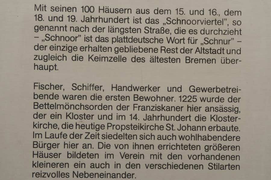 Schon im 13. Jahrhundert wurden erstmals Aufzeichnungen getätigt, in denen auf die Schnoorsiedlung am Rande des Franziskaner Klosters, von dem leider nur die Klosterkirche erhalten blieben ist, hingewiesen wird. Der Begriff Schnoor entstammt dem Plattdeutschen in der Bedeutung Snoor gleich Schnur. Gemeint ist damit eine schmale, enge Gasse, an denen sich beidseitig links und rechts die kleinen Siedlungshäuser aufreihen. So verwundert es wenig, das eine der Strassen, besser Gassen, auch den Namen "Schnoor" trägt.