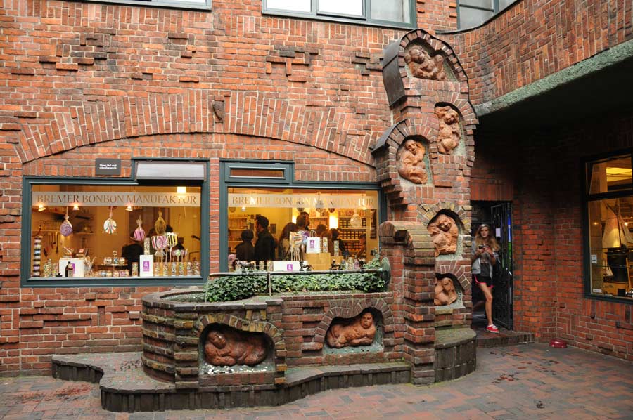 Obwohl die Böttcherstraße nur etwa 100 Meter lang ist, gehört sie doch zu den Hauptattraktionen der Bremer Altstadt. Im Mittelalter war die Böttcherstraße eine wichtige Verbindung zwischen Marktplatz und Weser. Hier wohnten und arbeiteten die Böttcher, daher der Name, Kimker, Fass- und Zubermacher. Als Mitte des 19. Jahrhunderts der Hafen verlegt wurde, verlor auch die Böttcherstraße zunehmend an Bedeutung. Dies änderte sich erst, als im Jahr 1902 (andere Quellen sagen 1906) der Bremer Kaffeekaufmann Ludwig Roselius auf Drängen der Besitzer das Haus Nr. 6 kaufte und dort den Verwaltungssitz seiner später weltberühmten Firma errichtete. Der Herr Roselius erwarb in den folgenden Jahren weitere Gebäude an der Böttcherstraße, andere Gebäude wurden nach dem Ersten Weltkrieg aufgrund von Baufälligkeit abgerissen. Zwischen 1922 bis 1931 erhielt Bernhard Hoetger den Auftrag von Roselius, die künstlerische Neugestaltung der Böttcherstraße zu übernehmen. So entstand das noch heute bestehende Häuserensemble für die Architektur des Expressionismus. Natürlich unter Verwendung von Backstein als Hauptbaumaterial unter Einbindung von Sandstein.