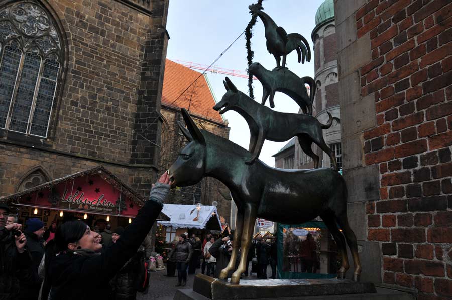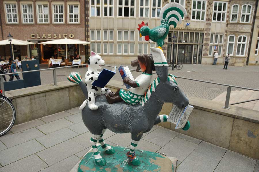 Wohl einem Jeden ist das Märchen um die vier Tiere (Hahn, Katze, Hund und Esel) der "Bremer Stadtmusikanten" ein Begriff, deren weltberühmte Figuren gleich neben dem Rathaus, klein und unscheinbar, anzutreffen sind.