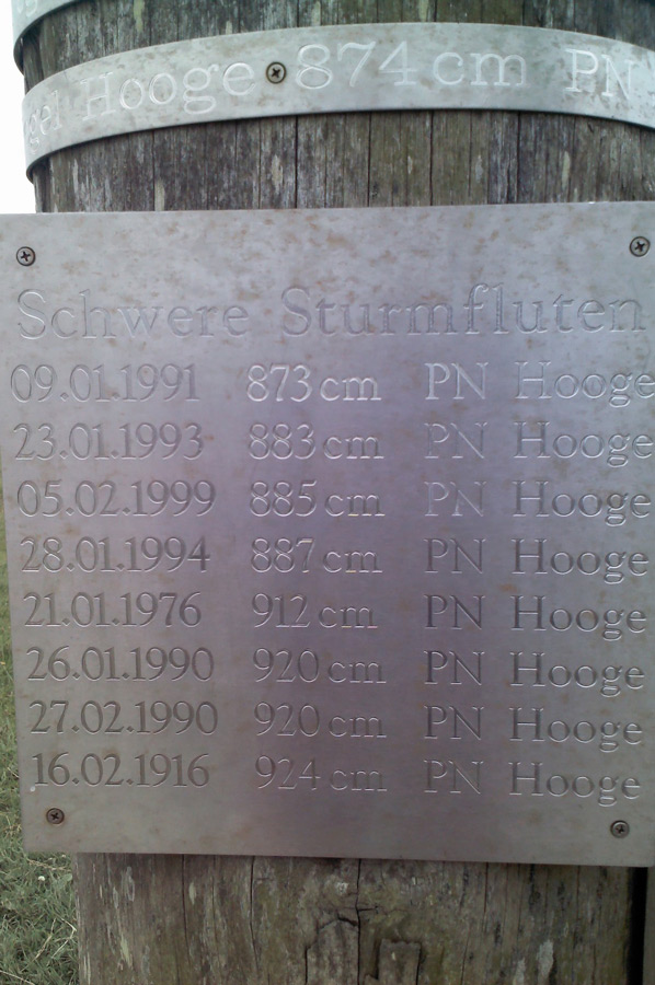 Wann immer es Sprüche dieser Art gibt, stellt sich für uns parallel auch die Frage nach der Siedlungsgeschichte auf dem "platten" Land vor allem in Hinsicht auf den Schutz vor Sturmfluten. Dies insbesondere aufgrund der Kenntnis, das noch heute Ebbe und Flut kräftig zur Gestaltung des Landes beitragen und Deiche erst ab dem 11. Jahrhundert im größeren Stil gebaut wurden. Unsere Besuche in Dangast aber auch in Neustadtgödens hatte die Probleme der Besiedlung im Norden bereits anklingen lassen, so waren uns besonders die Pegelmarken der Sturmfluten im Gedächtnis verblieben. Wie also konnten sich die Siedler auf den fruchtbaren Marschgebieten ansiedeln?