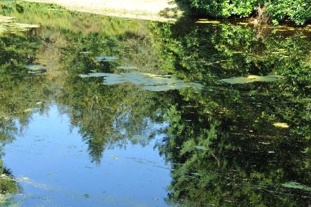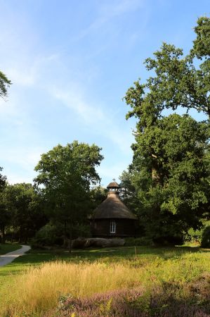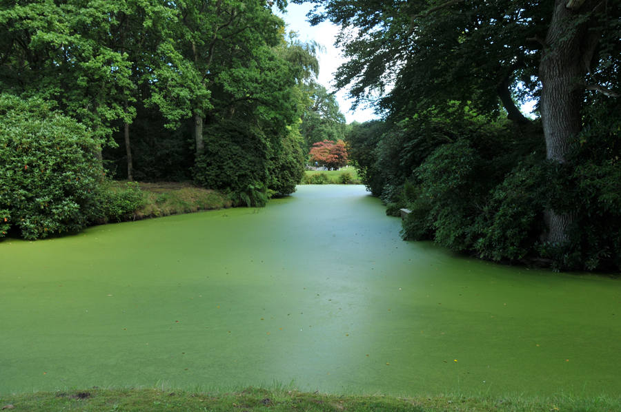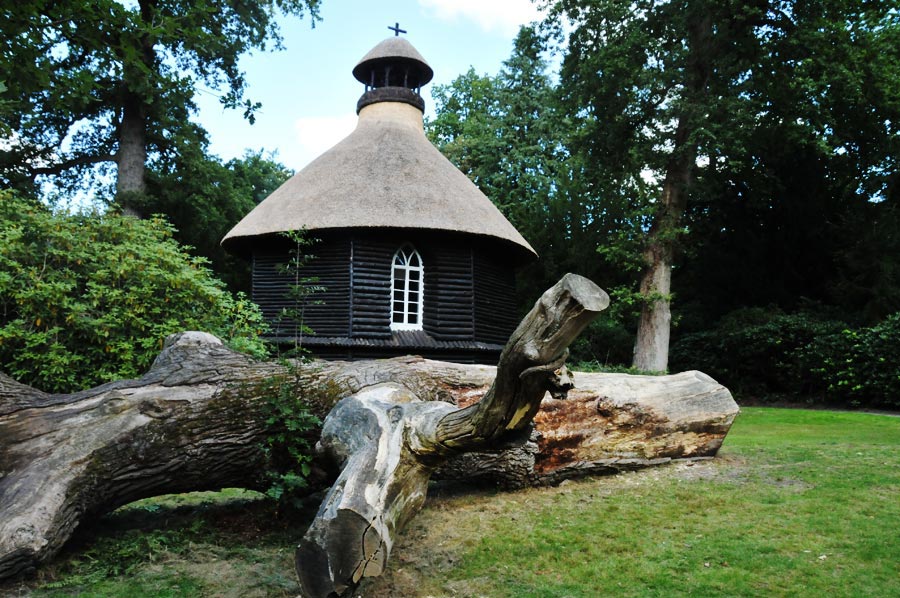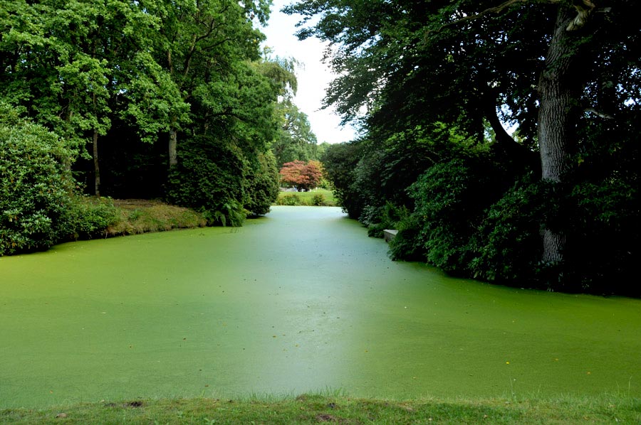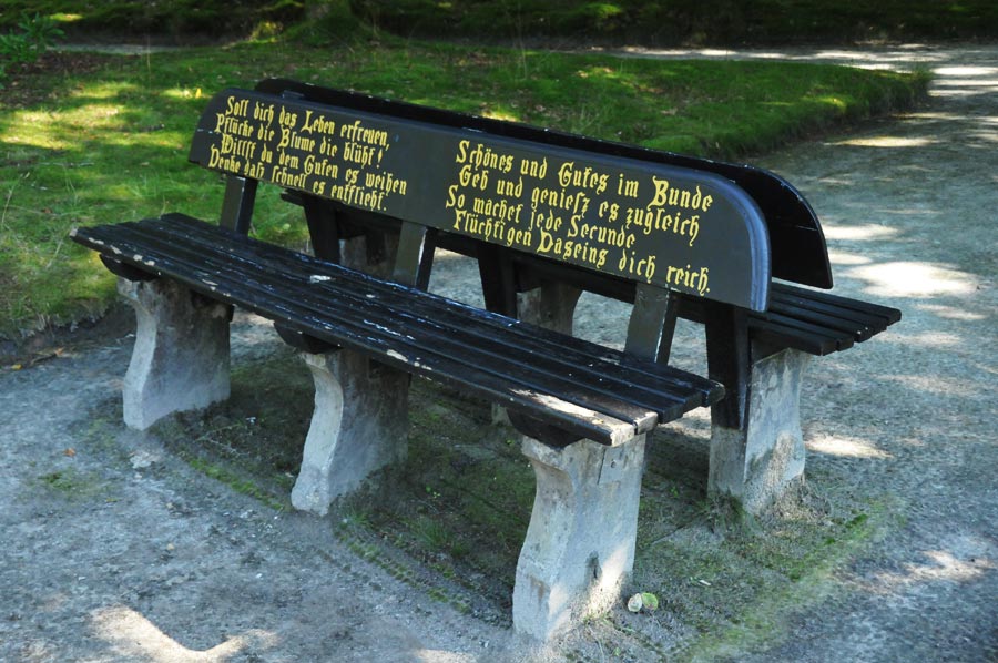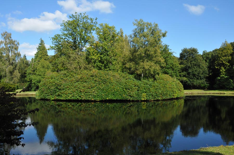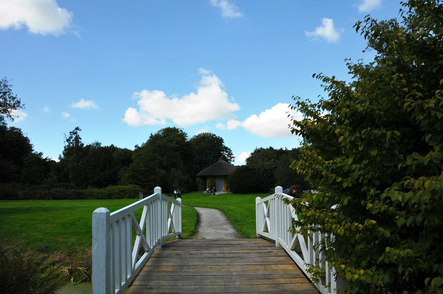 Wir machen uns nach all den Erzählungen und Erklärungen Folkert Fischers auf den Weg hinein in den Park, folgen den Hinweisen zu besonderen Punkten mit uralten Bäume, in deren Schatten mindestens ebenso alte Parkbänke stehen. Von Teichen und Wasserläufen, die manchmal komplett grün vom Entenquark überzogen sind, gelangen wir zu einem Aussichtshügel, zu einer hölzernen Kirche nach norwegischem Vorbild, finden Baumarten und Pflanzen in einer großen Vielfalt. Kurz, es ist eine wundervolle Parklandschaft, die nicht allein aufgrund der idyllischen Wege zu einem ausgiebigen Spaziertag einlädt. Stunden sind wir im Park unterwegs, allein um Licht- und Schattenspiele im Wasser der Teiche zu beobachten.