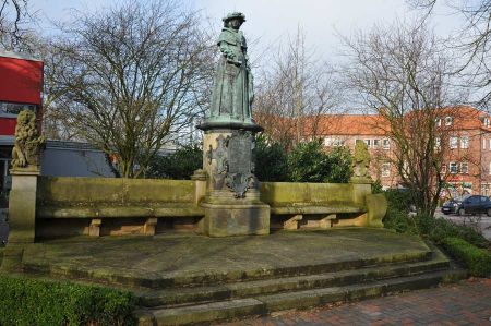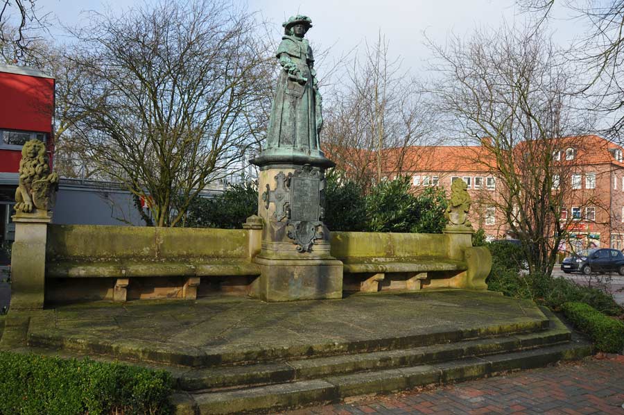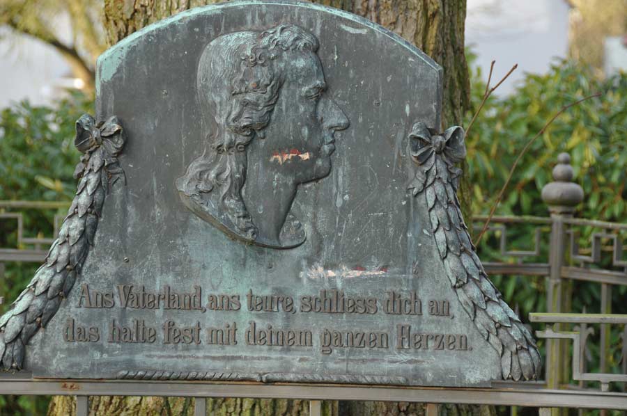 Wir folgen dem Kiebitzweg durch die Karl-Jaspers Anlagen und gelangen zum Schlosserplatz mit dem Denkmal für Friedrich Christoph Schlosser, der 1776 in Jever geboren wurde und von 1794 bis 1797 in Göttingen Theologie studierte. Er verfasste u. a. mehrere theologische Schriften. Nach dem Studium war er zunächst Hauslehrer und ab 1808 Konrektor in Jever.