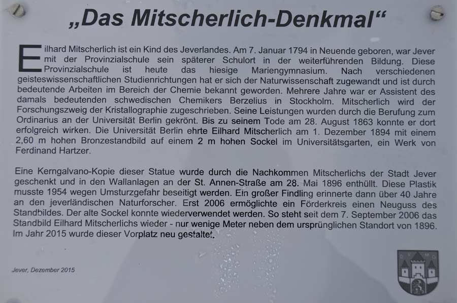 Das Denkmal für Eilhard Mitscherlich steht in den Wallanlagen und ehrt den im damals zur Herrschaft Jever gehörenden Neuende geborenen Wissenschaftler. Das Denkmal ist eine detailgetreue Nachbildung des Berliner Originals, das 1894 zum 100. Geburtstags des Naturwissenschaftlers vom Bildhauer Ferdinand Hartzer geschaffen wurde und seit 1919 vor dem Mittelrisalit des Ostflügels der Humboldt-Universität zu Berlin steht. Das jeversche Denkmal wurde am 6. September 2006 eingeweiht und ist bereits das zweite Denkmal des Naturforschers, da es bereits von 1896 bis 1954 ein Denkmal mit der gleichen Statue an diesem Standort gab.