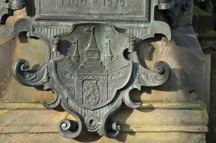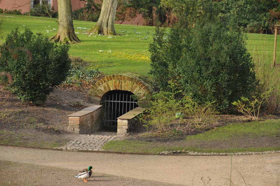 Unser Weg führt und dann entlang der Prinzengraft, die einmal mit der Schlossgraft verbunden war und damit den Ring um die Altstadt schloss. Die Anlage des jetzigen Schlossparks geht auf das Jahr 1838 zurück. Vorbild waren die so genannten englischen Landschaftsgärten, die sich in Form und Stil im England des 18. Jahrhunderts entwickelt haben. Neben bekanntem europäischem Laubholz (zum Beispiel Rotbuche, Eiche, Linde) bietet der Schlosspark auch einige exotische Gehölze. Dazu gehören unter anderem der nordamerikanische Tulpenbaum, der südostasiatische Katsurabaum sowie der aus dem südwestlichen China stammende Urwelt-Mammutbaum. Wir umrunden den Schlosspark und gelangen bis vor die Tore des Vorhofs, wo wir auf das Denkmal Fräulein Marias treffen.