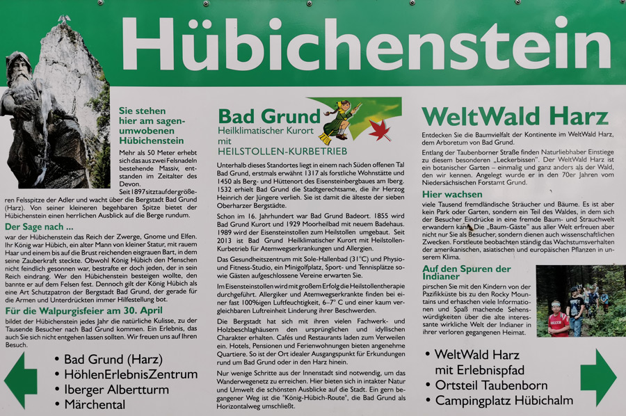 Eine weit über den Harz hinaus bekannte Sage berichtet, dass der Hübichenstein bei Bad Grund in vergangenen Zeiten das Zuhause von Zwergen, Gnomen und Elfen gewesen sei: