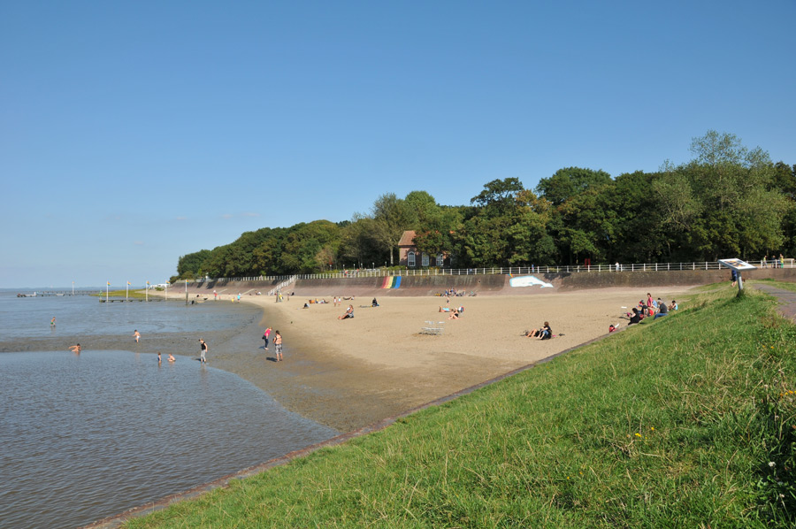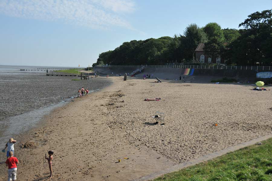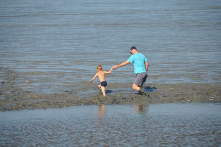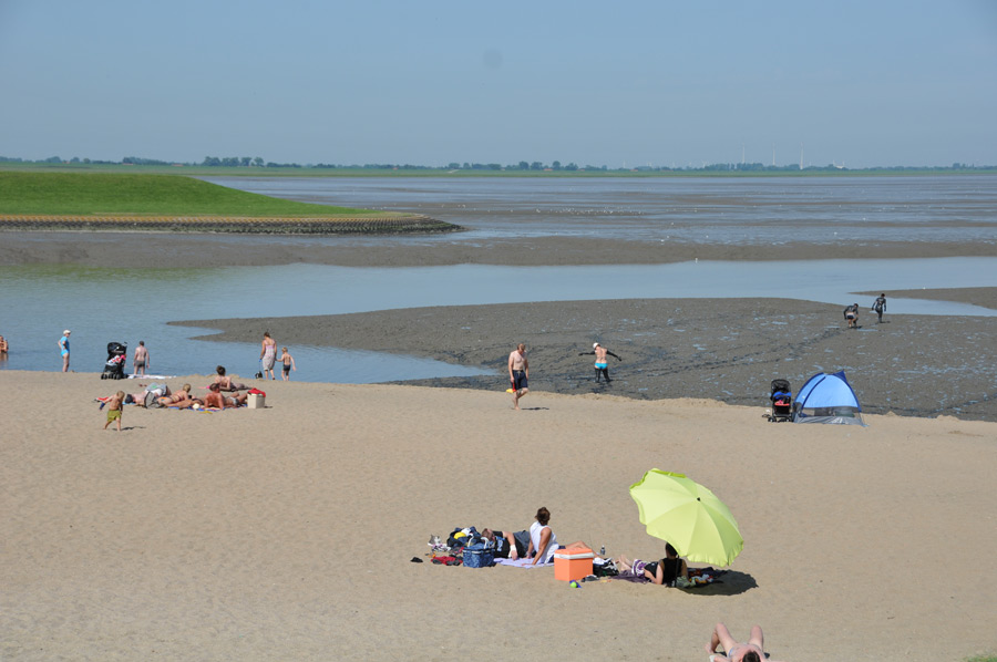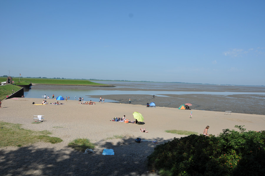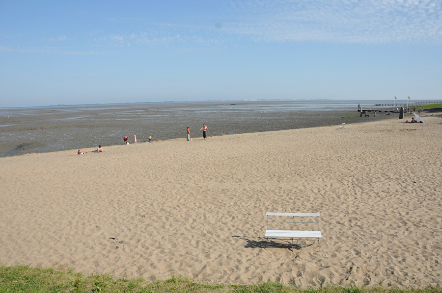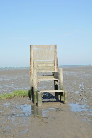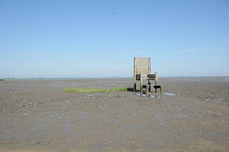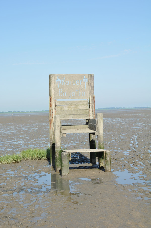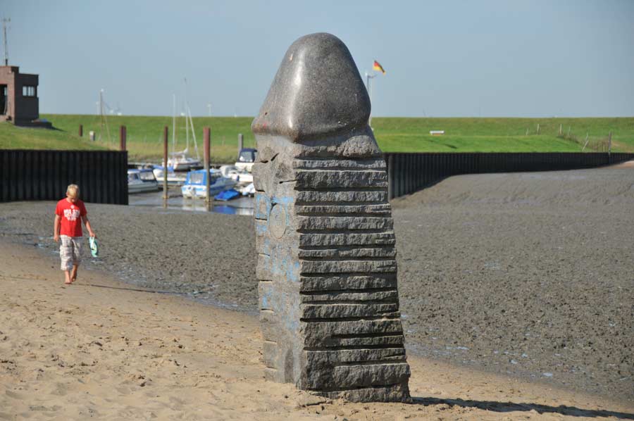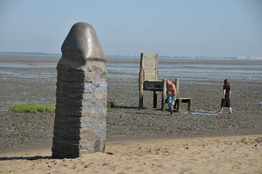 Unser Weg führt uns dann über den Sommerdeich zum Strand von Dangast, der direkt unterhalb des Kurhauses beginnt. Bereits um diese frühe Stunde haben sich erste Gäste eingefunden, die mit Strandmatten und Badehandtüchern bewaffnet auf das Hochwasser warten. Aufgrund seiner Lage ist das Wattenmeer vor Dangast sehr schlickig, weshalb nur wenige ganz Mutige zur Wattwanderung an die Fahrrinne unterwegs sind. Ein buntes Gemisch von Gästen, die sich mit Familie und Hund hier einfinden. Natürlich ist auch der Phallus direkt am Schlickrand noch immer ein Hingucker genau wie der Thron für den/die jeweilige Schlickkönigin, einer Holzkonstruktion die für diverse Aktivitäten genutzt wird, so auch für das legendäre Schlickschlittenrennen oder wenn die Aktionsgruppe „Menschenmüll“ mit ihrem „Wattgolfen“ aktiv wird.