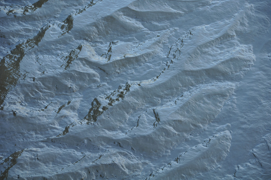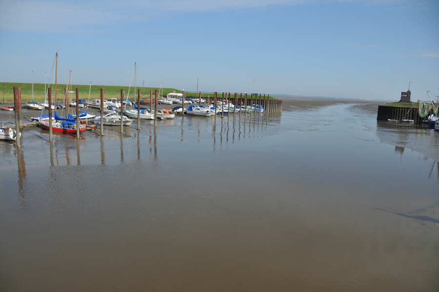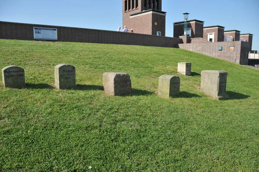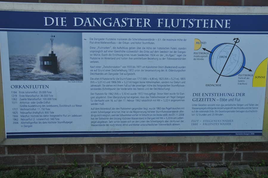 In Dangast angekommen, führt uns der erste Gang zwangsläufig an das Hafenbecken, wo das ebenfalls schon als legendär zu bezeichnende Fährgastschiff „Etta von Dangast“ auf dem jetzt zu sehenden Schlick trockengefallen ist. Anders als in den meisten Häfen an der Nordseeküste, ist der Hafen von Dangast tidenabhängig. Jetzt fliest nur noch ein wenig Restwasser aus dem Hafenbecken ab, das durch Süßwasser aus dem Ellenserdammer Tief noch etwas Zulauf erhält. Weithin sichtbar ist jetzt die Fahrrinne, die bei Hochwasser durch die aufgestellten Pricken im Watt befahren werden muss. Gleich am Deich des Außenhafen stoßen wir auf die Steinmonumente, die zum Gedenken an die starken Fluten neben den Jahreszahlen auch die jeweiligen Wasserstände vermitteln.