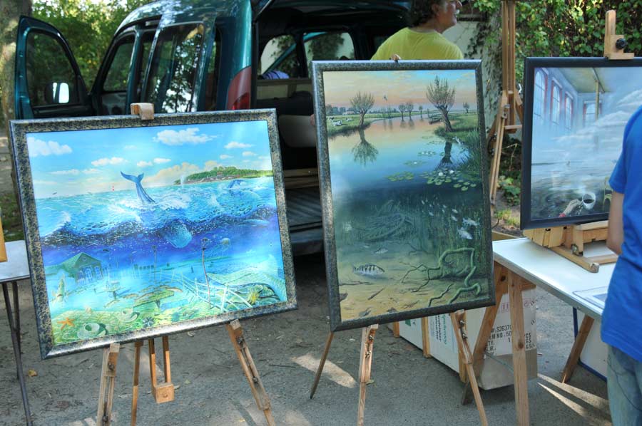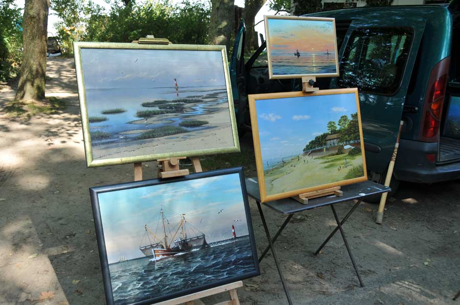 Wir verlassen den Strand und schlendern entlang der Verkaufsstände, die neben dem üblichen Allerlei aber auch Kunst anbieten. Da ist also der Holzschnitzer, der aus Treibholz in der Kombination mit anderen Werkstoffen herrliche Skulpturen schafft, dann der Maler, der in bester M.C. Escher Manier gleich mehrere Horizontlinien mit Motiven aus Dangast und seiner Phantasie in seine Bilder integriert. Natürlich gibt es auch allerlei Kulinarisches im Angebot der Händler.