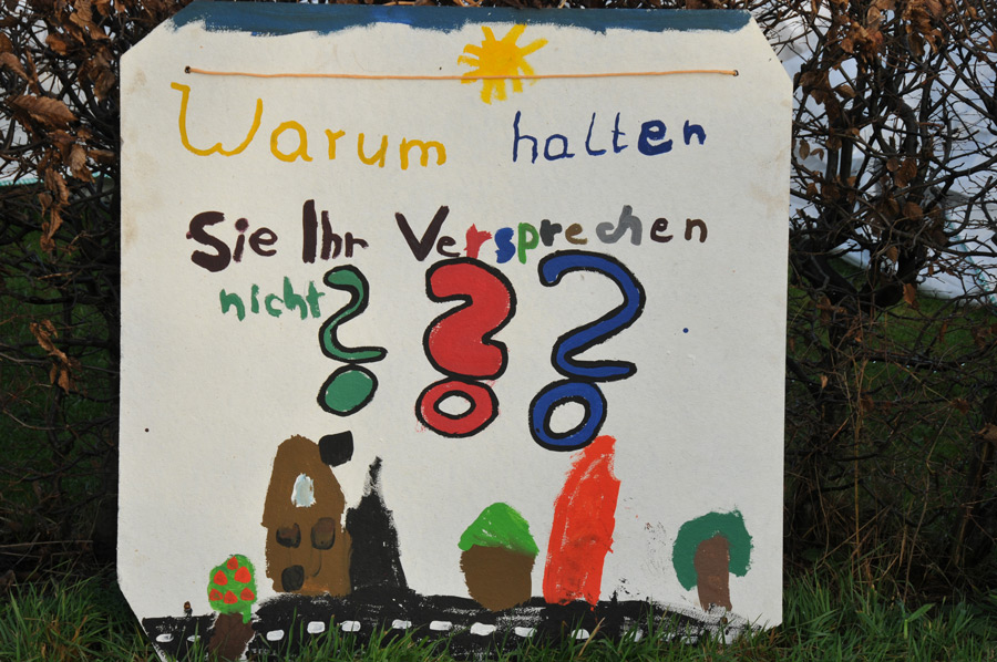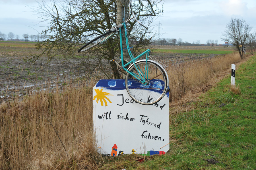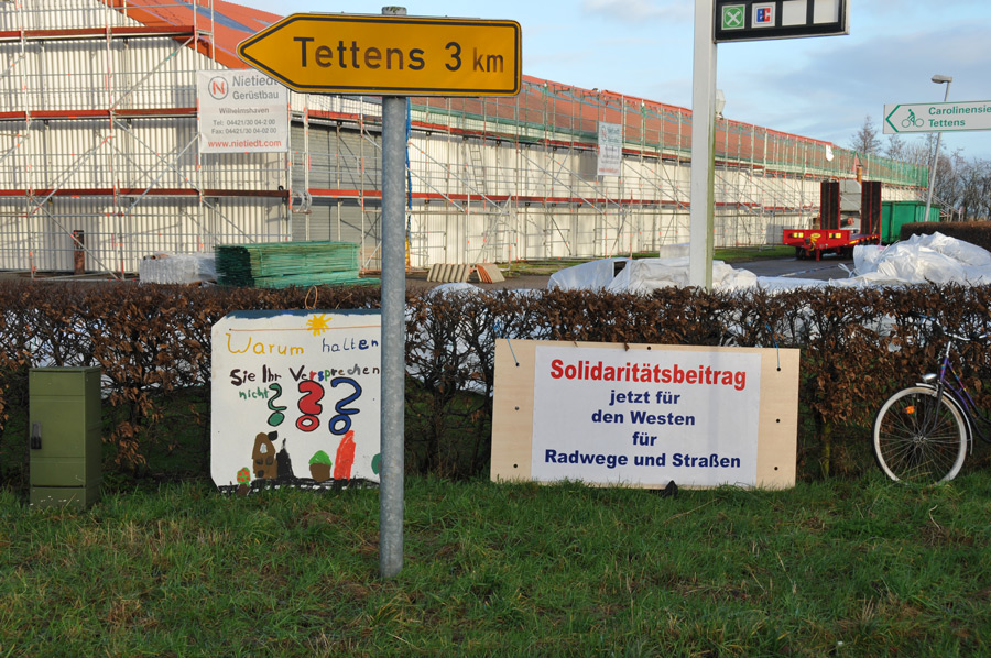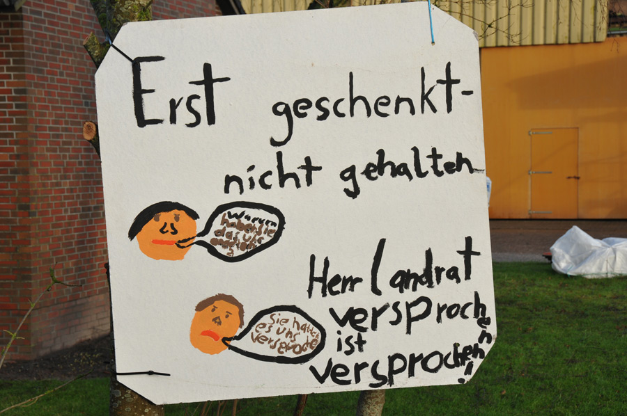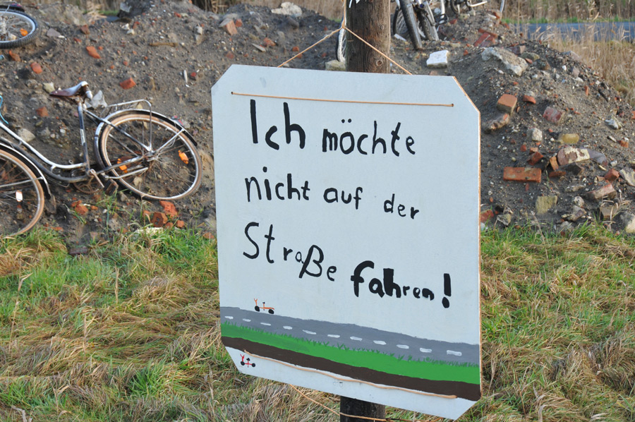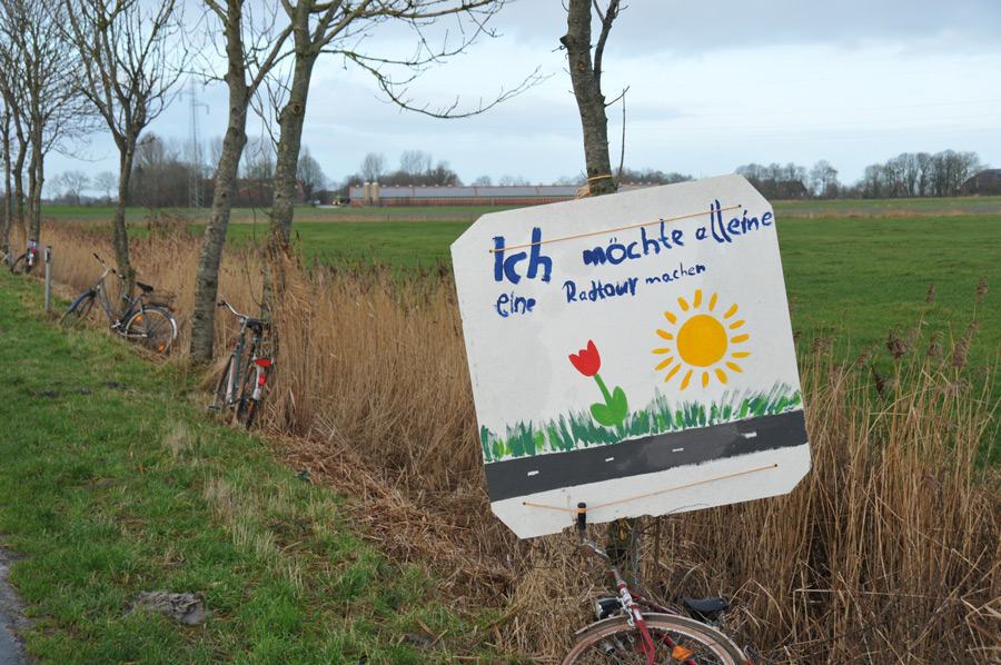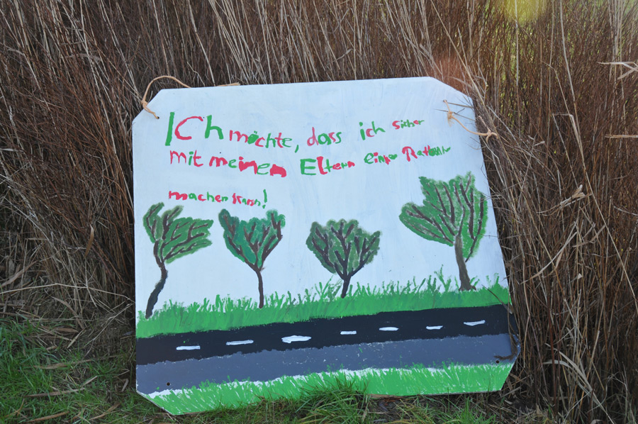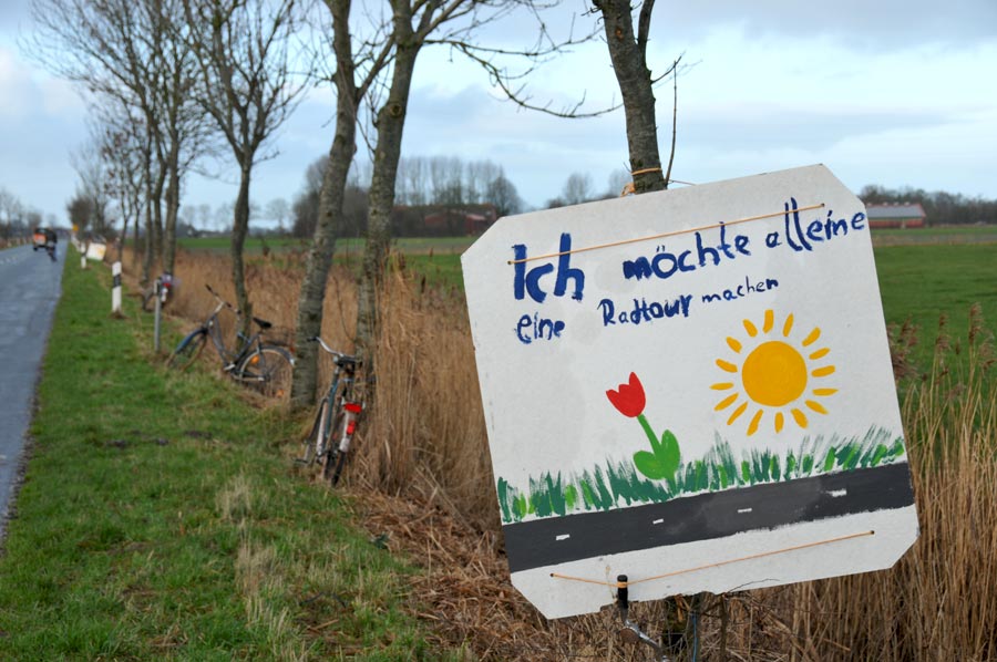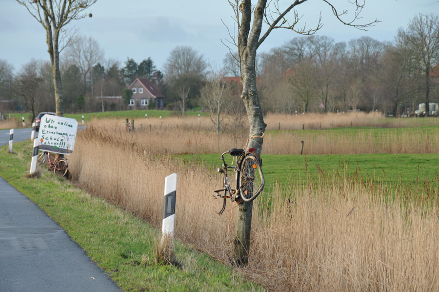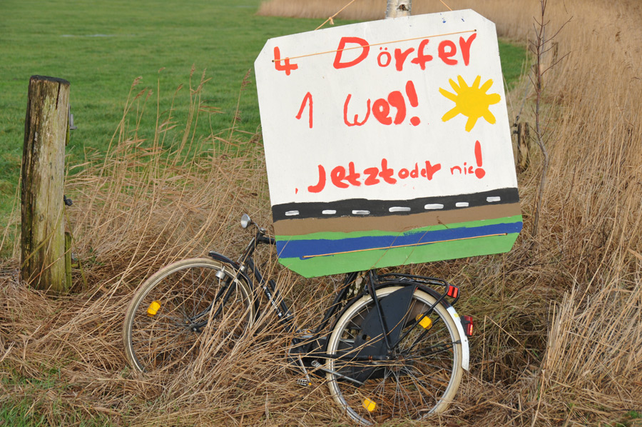 Nur wenig später wurde uns klar, dass es sich hier um eine Protestaktion der hiesigen Bürger handelte, denn erste Plakate wiesen auf den Missstand des fehlenden Fahrradweges entlang der Kreisstraße 89 hin. Jetzt war unser Interesse geweckt und schnell fanden wir auch erste Passanten, die uns freudig Auskunft zu der Protestaktion gaben. Seit etwa 20 Jahren fordern die Anlieger den Bau eines Fahrradwegs entlang der Kreisstraße 89, die die Orte Middoge, Tettens, Pievens und Oldorf miteinander verbindet. Da bislang nicht passiert ist, wurde der Bürgerprotest jetzt etwas massiver. Dabei ist das Fahrrad neben dem Auto das meistgenutzte Verkehrsmittel zwischen den Dörfern um zur Schule oder zum Einkaufen zu fahren. Der Protest richtet sich vor allem also auch für Einrichtung eines sicheren Schulwegs für die Kinder.