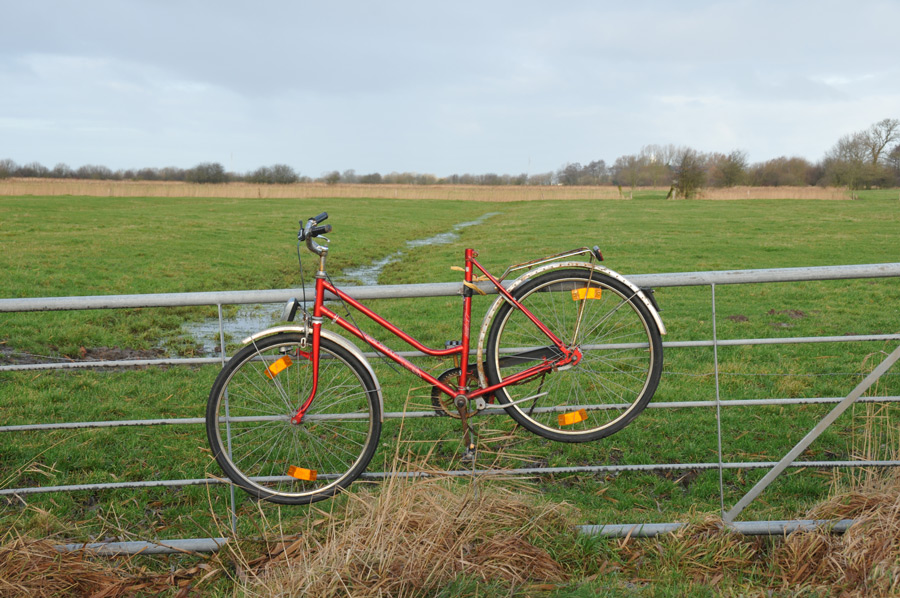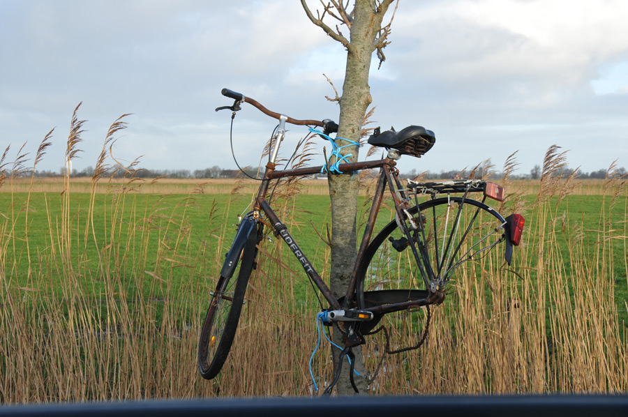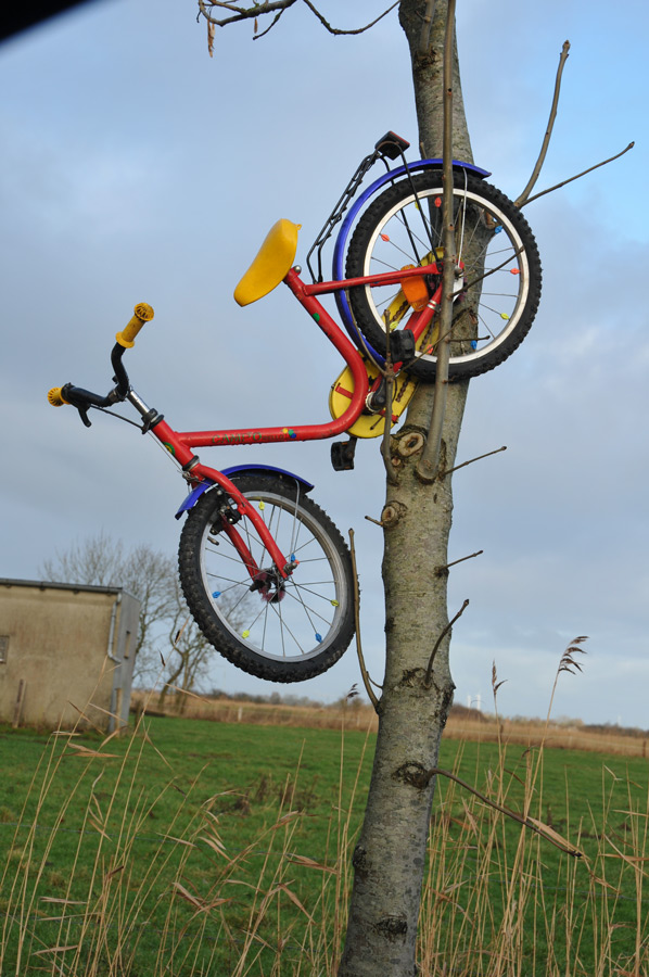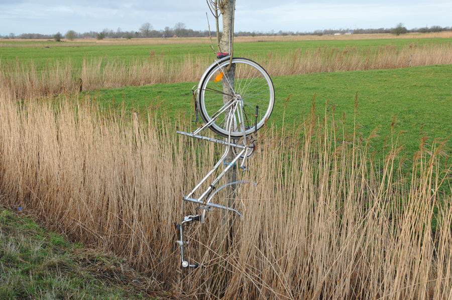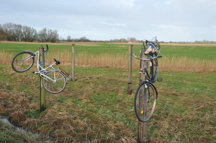 Schon nach dem ersten Kilometer waren uns die vielen Fahrräder aufgefallen, die rechts und links der Straße nach Middoge in und an den Straßenbäumen befestigt waren, am Straßenrand oder an Gattern zu den Viehweiden standen. Merkwürdig, war der erste Gedanke. Denn weder eine Bushaltestelle noch sonstige Einrichtungen waren zu erkennen, die das Abstellen von Fahrrädern erklären konnten. Sollten Scherze zu Silvester zu diesem Fahrradensemble geführt haben? Teilweise mit Schäden behaftet, machte eine Vielzahl der Fahrräder allerdings durchaus den Eindruck der Gebrauchsfähigkeit.