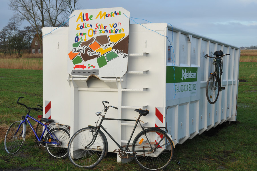 Jetzt stehen oder hängen also Fahrräder an fast jedem Straßenbaum, an den Schildmasten, an Zäunen und Ortsschildern, weisen Plakate und Poster auf den dringenden Bedarf des Radwegs hin. „Wir wollen ohne Erwachsene zur Schule fahren“ ist auf einem Plakat zu lesen. „Ich möchte sicher über die Tettenser Kreuzung fahren“ auf einem weiteren Plakat. Jung und Alt sind sich bei dieser Aktion einig: ein Radweg muss her. Kinder der Tetta-von-Oldersum- Grundschule, die teilweise von Middoge und Oldorf jeden Morgen auf der Kreisstraße zur Schule fahren müssen, ein riesig hohes Gefahrenpotential in der Dunkelheit, das immer wieder zu Unfällen geführt hat. Alle zum Protest notwendigen Mittel sind von den Bürgern selbst aufgebracht worden. Hilfe gab es allerdings von zwei Firmen aus dem Bereich des Schrotthandels, die ein Großteil der Räder zur Verfügung gestellt haben.