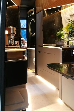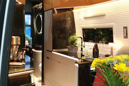 Den höhergelegten Mercedes Sprinter von Robeta soll es zukünftig optional auch mit Allradantrieb geben. Innen hat man eher das Gefühl, als stünde man an Bord eines modernisierten Segelschiffes. Für den Möbelbau und den hochwertigen Boots-Look wurde ein Yachtausbauer hinzugezogen. In der Küchenzeile wurde schwarzer Kerrock verbaut – ein Material, das wie Marmor aussieht, dabei aber deutlich leichter ist. Er bildet einen starken Kontrast zu dem warmen Holz, dem weißen Stoff an den Wänden und dem weißen Fußboden in Marmor-Optik.