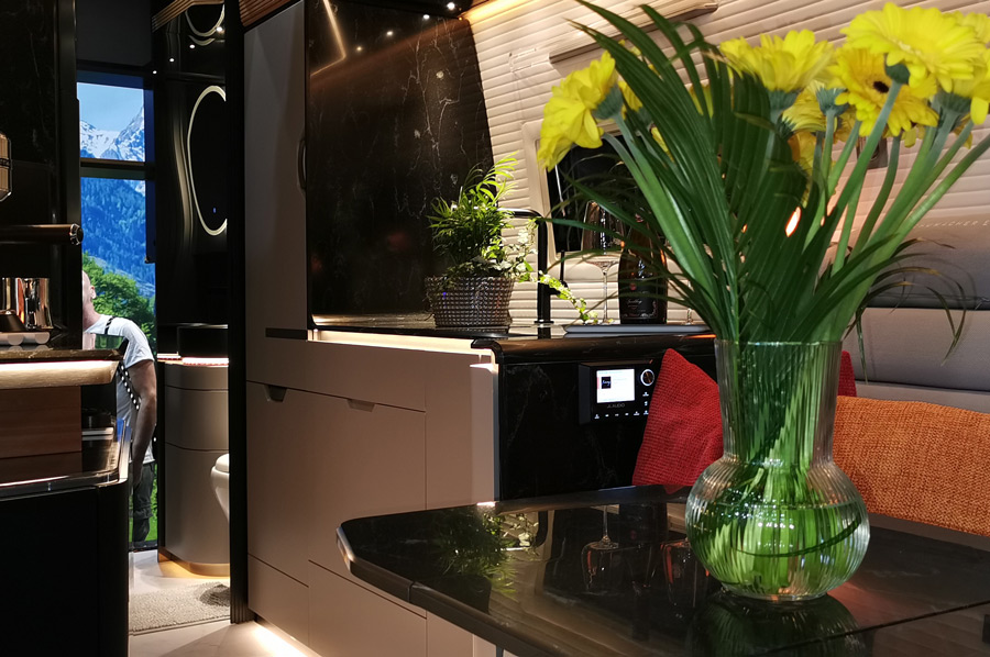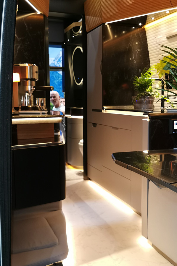 Die Küche besitzt nicht nur einen Induktionsherd, sondern auch einen Geschirrspüler und einen Weinkühlschrank. Für große Liner in der Kategorie Morelo & Co durchaus normal, für einen Campervan allerdings doch sehr ungewöhnlich.