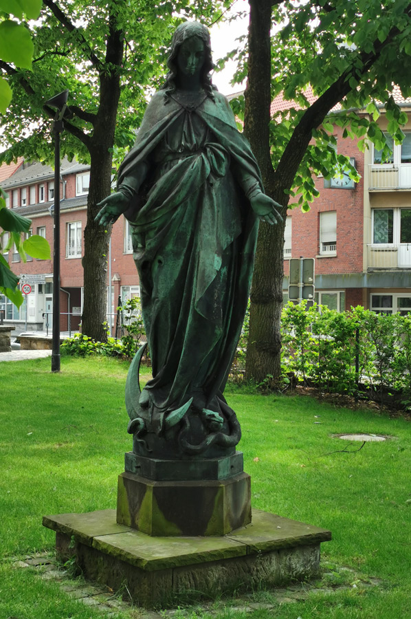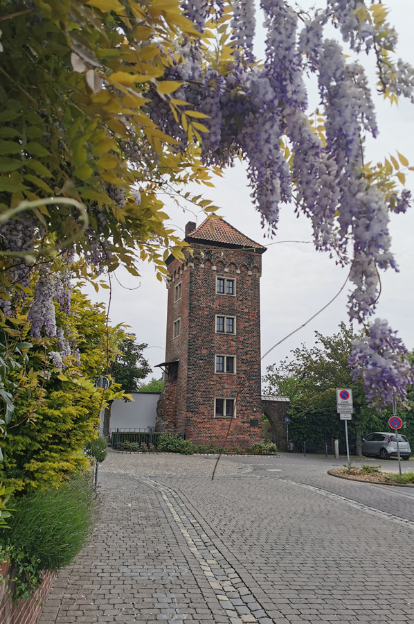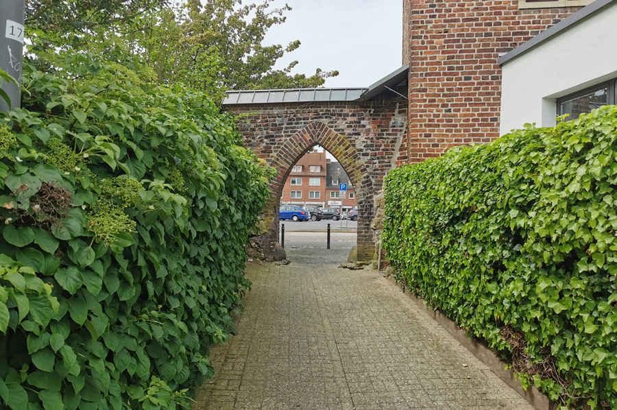 Wir beginnen unseren heutigen Rundgang am Parkplatz Nonnengasse und stehen direkt vor dem so genannten Nonnenturm, durch dessen geklinkertes Tor wir in den Probst-Dümpelmann-Weg gelangen. Der Nonnenturm ist neben dem Lorenkenturm und dem Lüdinghauser Tor einer von drei noch erhaltenen Teilen der ehemaligen Stadtbefestigung von Dülmen. Der Turm mit quadratischem Grundriss zeigt an seiner Seite noch Reste der Dülmener Stadtmauer. Der Nonnentum ist der letzte von ehemals drei eckigen Türmen der alten Befestigung. Der heute viergeschossige Turm stammt aus dem 16. Jahrhundert und wurde ursprünglich als Pulverturm genutzt. Die Stadtbefestigung verfiel Mitte des 17. Jahrhunderts nach und nach. Der Turm gelangte 1730 in Privatbesitz und wechselte mehrfach den Eigentümer. 1953 wurde der Turm verändert wieder aufgebaut. Das Innere des Turms ist heute Teil einer Wohnung. Die letzte Renovierung erfuhr der Nonnenturm 1982. Der Name des Turms bezieht sich auf das in der Nähe befindliche und mittlerweile aufgehobene Nonnen-Kloster der Augustinerinnen mit dem Namen Agnetenberg, dessen bekanntestes Konventsmitglied Anna Katharina Emmerick war (auch dazu später mehr).