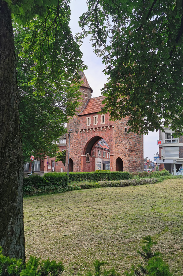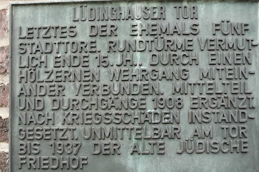 Über den Nonnenwall gelangen wir an den ehemaligen jüdischen Friedhof, auf dem heute ein Mahnmal an die Pogrome der Nazizeit erinnern, im Hintergrund ist bereits Lüdinghauser Tor zu sehen. Das Tor (oder auch Lüdinghauser Pforte oder Ludinchuser Porten) wurde wahrscheinlich im 14. Jahrhundert als hölzernes Tor im Rahmen der Stadtbefestigung errichtet.