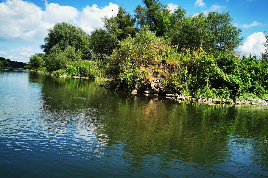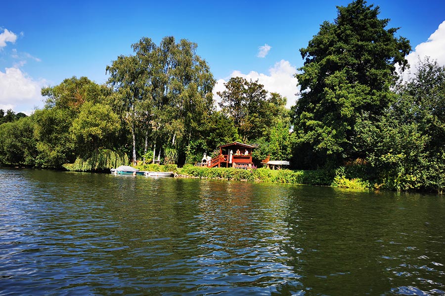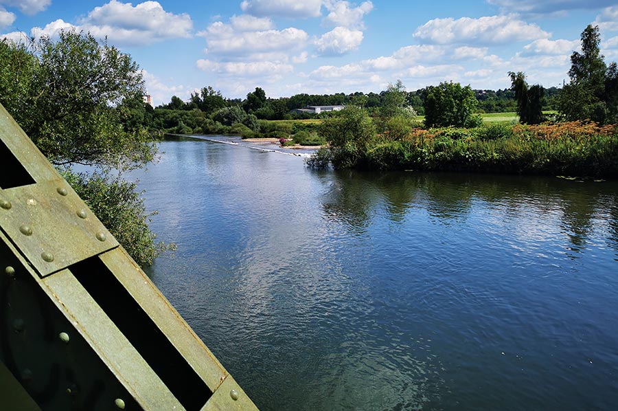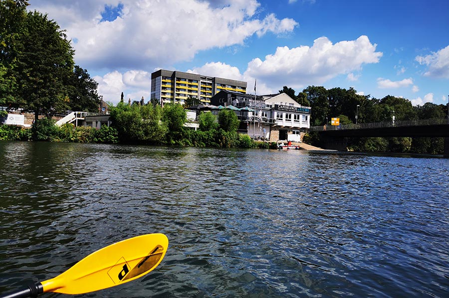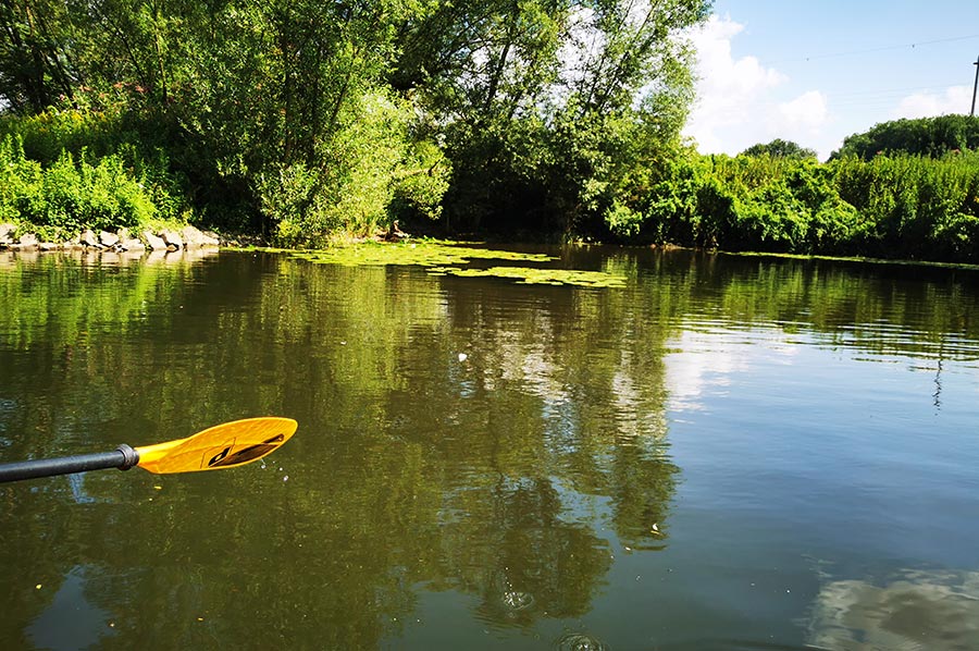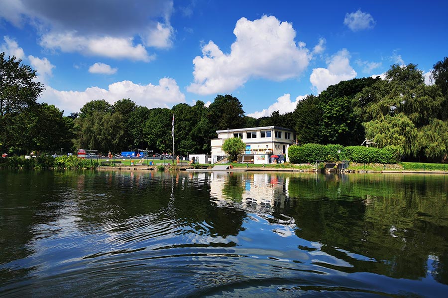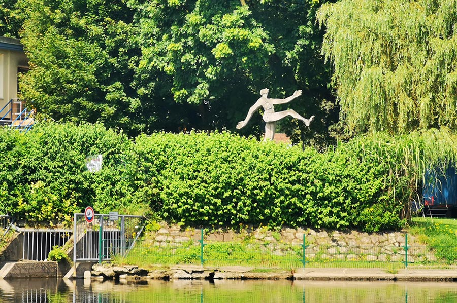 Ob allein mit sich und dem Boot oder gemeinsam mit anderen: Die Ruhr übt auf Ruderer und Kanuten eine große Anziehungskraft aus, so auch auf uns. Und glücklicherweise verfügen wir auch über entsprechendes „Wasserfahrzeug“, das uns auf allen Reisen begleitet: das aufblasbare Schlauchboot Gumotex Palava, ein Kanadier, der für Touren und aufgrund des Bodens auch für leichtes Wildwasser oder Rafting gut geeignet ist. So waren wir auf dem Oymapinarsee in der Türkei genauso sicher unterwegs wie auf der Cetina bei Radmanove Mlinice in Kroatien. In einem Rucksack zusammengerollt und gut tragbar, dann schnell aufgebaut besser aufgeblasen und einsetzbar, eine tolle Option zumal auch in öffentlichen Verkehrsmitteln mitführbar. Heute soll es vom Campingplatz zunächst flussabwärts auf der Ruhr gehen, auch wenn auf dem Rückweg das Paddeln gegen die Strömung ansteht. Wir passieren das Café Capobianco, dann das Ufer-Schwimmbad von Essen und die Sohlschwellen der Ruhr unterhalb, die heute umfahren werden können.