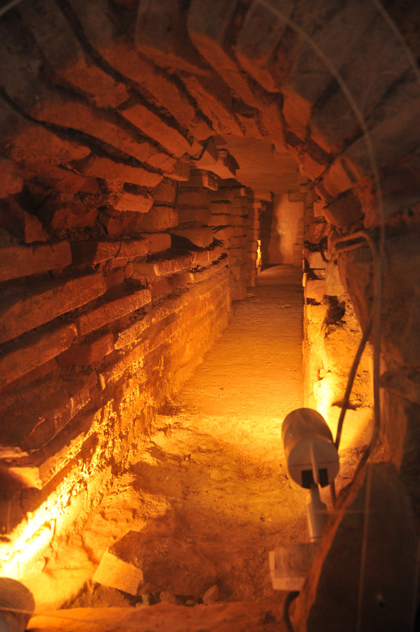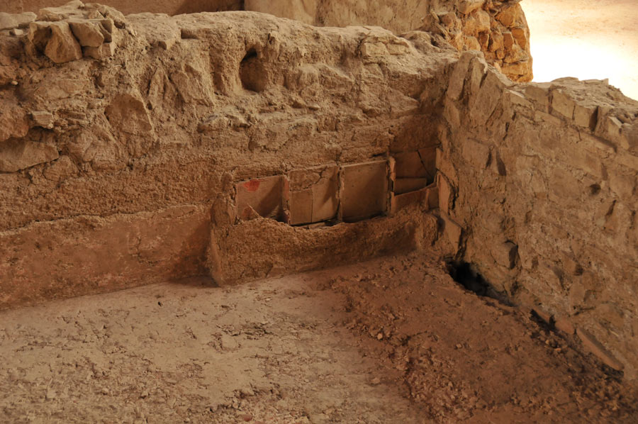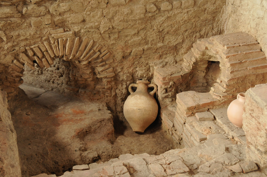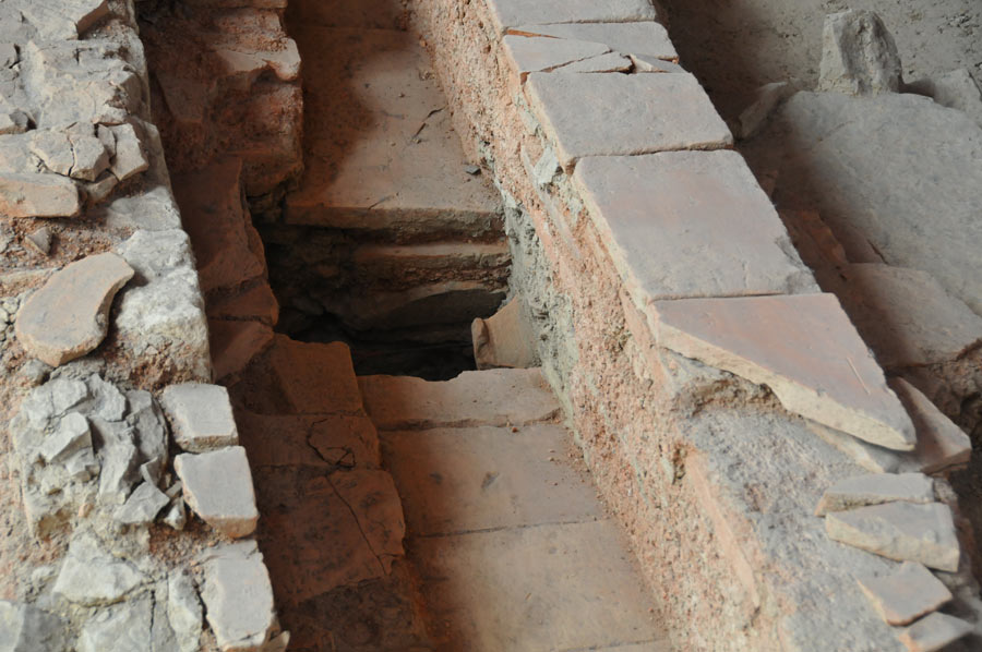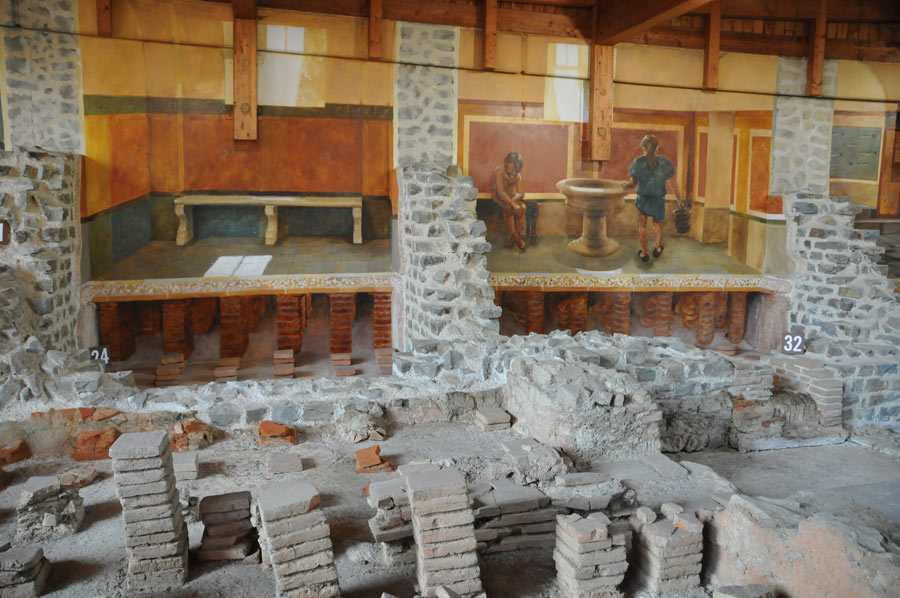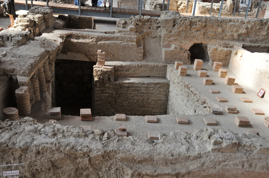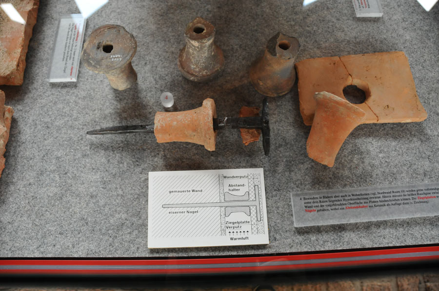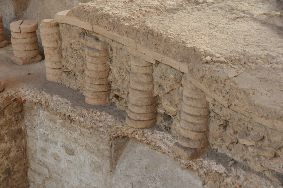 Wie in vielen Gebäuden der Römer gab es auch hier ein ausgeklügeltes System der Hypokausten Heizung durch heißen Rauch, der hier in diesem Anwesen sogar über feine Kanäle in den Wänden abzog und somit auch diese noch erwärmte. Trotz der Vielzahl der verschiedenartigen Konstruktionen hatten wir eine solche Anordnung von Heizkanälen bislang auch noch nicht gesehen. Die doppelten Fußböden waren in der üblichen Konstruktionsart mit runden oder eckigen Steinplatten aufgesetzt, die nach 5 Lagen im Durchmesser vergrößert in der darauf folgenden Lage eine dichte Fußbodenplatte bildeten, auf die dann der römische Estrich aufgebracht wurde. Sehr gut in einem der Räume zu erkennen, der wohl durch Steinräuber mit Gewalt geöffnet worden war, so deuten es jedenfalls die Durchbruchkanten an.