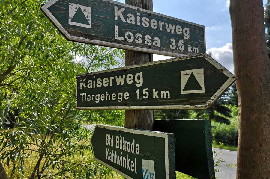 Der "Kaiserweg" (als Markierung wurde grünes Dreieck gewählt) verläuft durchs Kuhtal, zunächst parallel mit dem Hauptwanderweg, zweigt dann ab in Richtung Bucha ab, führt durch das reizvolle Waldgebiet "Toter Mann" nach Zeisdorf, dann entlang des Klefferbachs nach Lossa, weiter am Flüsschen Lossa entlang nach Billroda und schließlich zum Kläfferberg (300,4m).