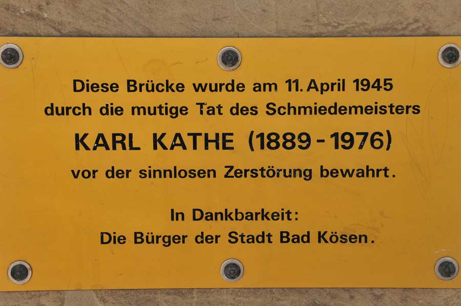 Karl Kathe oder Paul Hein? Oder beide? In der Kurstadt erhält ein altes Thema immer wieder neue Aufmerksamkeit - ausgelöst durch eine „zementierte“ Tatsachenbehauptung: der Schmiedemeister Karl Kathe ist der Retter der heutigen „Brücke der Einheit“. Er durchtrennte mit einer Kombizange das Hauptkabel zur Sprengladung. Eine im September 2005 an der Brücke eingeweihte Tafel würdigt das - und ist seitdem Stein des Anstoßes für die Nachfahren des Paul Hein. Sie berufen sich auf Aufzeichnungen des Vaters, unter anderem erschienen 1969 im DDR Militärverlag.