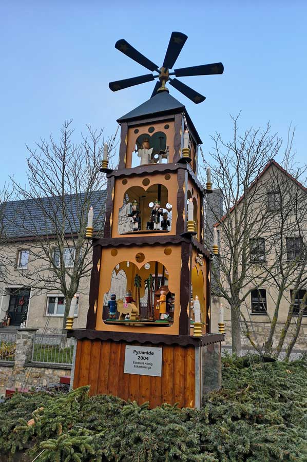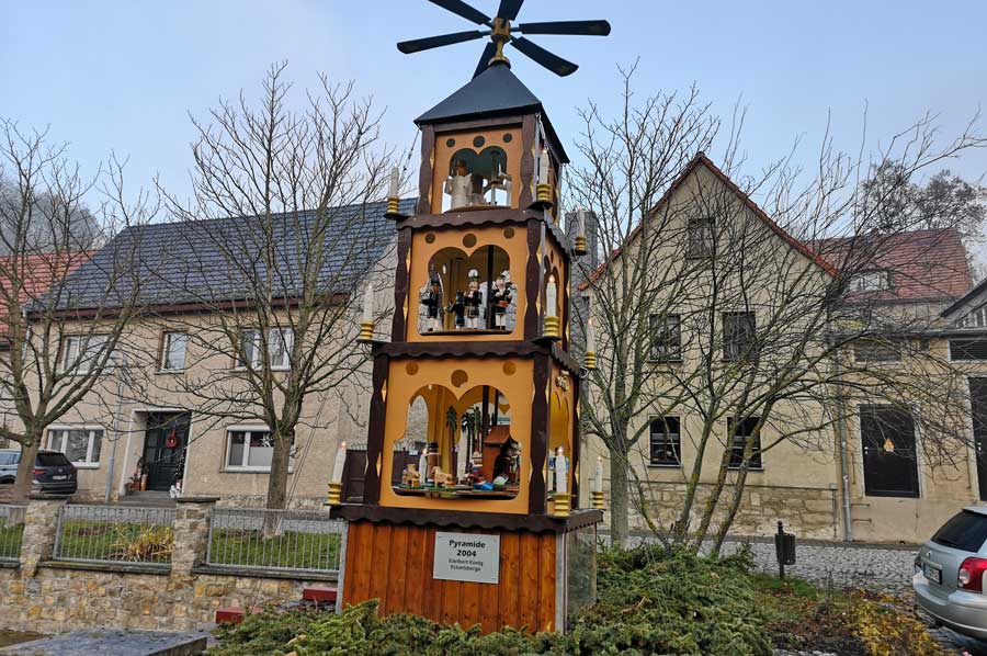 Ja, es ist die Rede von den Weihnachtspyramiden, die vor allem aus dem Erzgebirge stammend, heute als ein Bestandteil der Volkskunst gelten und in Städten und Privathaushalten weit verbreitet sind. Wir waren im Nachbarort Eckartsberga unterwegs, wo wir auf die in den Bildern gezeigte Weihnachtspyramide stießen.