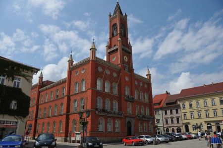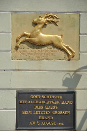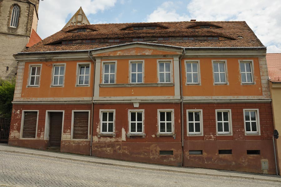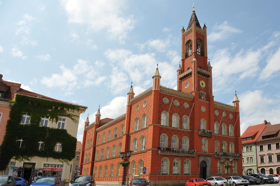 Direkt gegenüber der Kirche befindet sich die bereits angesprochene Lessing-Gedenkstätte am ehemaligen Standort des Geburtshauses Lessings. Das Lessinghaus gehört zu den 20 kulturellen Gedächtnisorten in den neuen Ländern. Wir gelangen jetzt zum Rathaus, das 1847 bis 1848 durch Carl August Schramm im Stil der italienischen Neorenaissance erbaut wurde. Auf dem Markt vor dem Rathaus befindet sich der Andreasbrunnen mit Justitia-Statue aus Sandstein.
