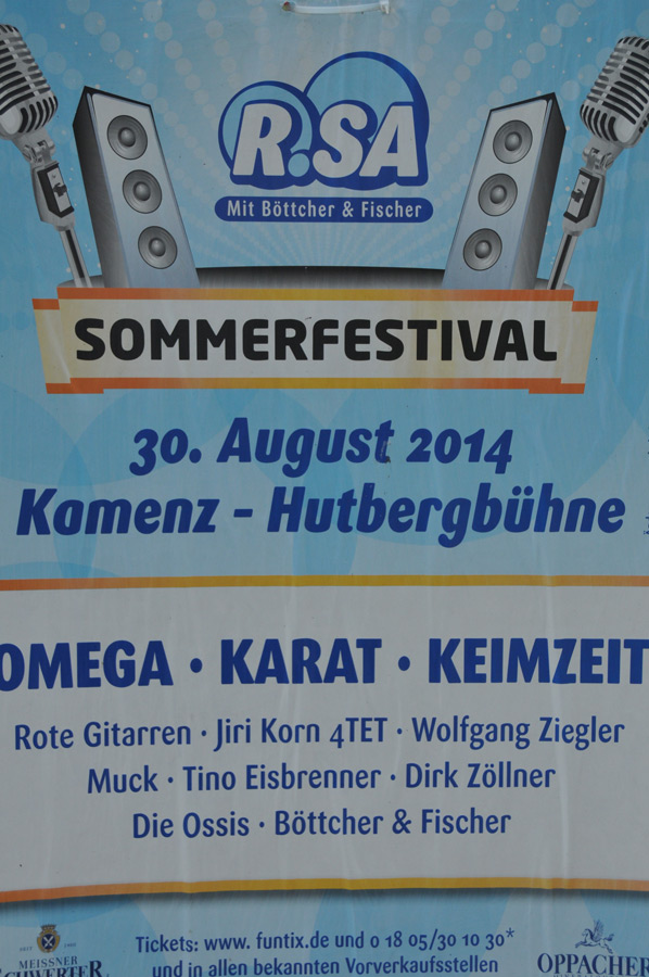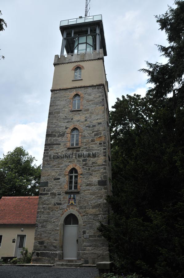 Unser nächstes Ziel ist die St. Just Kirche an der Königsbrückerstraße, die wir leider komplett verschlossen vorfinden. Das ist sehr bedauerlich, denn gerade diese Kirche war eines der Hauptziele unserer ersten Erkundung. Kurz entschlossen setzen wir den Anstieg fort und gelangen so auf den Hutberg, der neben dem Lessingturm auch die Hutbergbühne aufweisen kann, eine Freilichtbühne für bis zu 10.000 Zuschauer. Plakate weisen auf einige bekannte Namen des Showbiz hin, die hier gastierten.