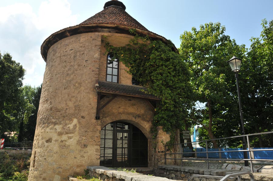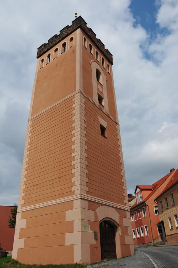 Entlang der Pulsnitzerstraße gelangen wir wenig später bis zum Roten Turm, der als einer der wenigen Artefakte der mittelalterlichen Stadt- und Klosterbefestigung erhalten geblieben ist. Weitere Überreste findet man in der Stadtschreiberbastei („Pichschuppen“), in der Mönchsmauer und im Klostertor.