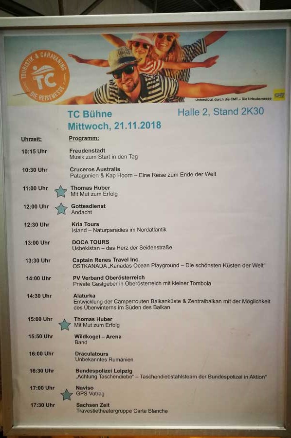 Wir freuen uns auf die Präsentation unserer Projektarbeit während der TC Touristik und Caravaning vom 21. bis 25. November in Leipzig im Rahmen des Bühnenprogramms in Halle 2, Stand 2K30. Nutzen Sie auch die Projektpräsentation auf unserem Stand in Halle 2, 2G43 - alaturka.info / camper-route.de.
