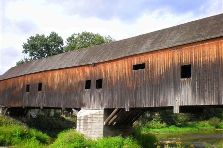 So waren wir quer übers Land unter Vermeidung der Autobahnen nach Gera-Wünschensdorf gekommen, wo wir zunächst die Weiße Elster überqueren mussten und dies noch dazu über eine einspurige, überdachdachte Holzbrücke, die zu den letzten noch erhaltenen überdachten Holzbrücken in Deutschland zählt. Die Brücke steht heute unter Denkmalschutz und wir erinnerten uns an eine vergleichbare Brückenkonstruktion in Cheb in Tschechien. Die Brücke von Wünschendorf war bereits im 13. Jahrhundert erstmals errichtet und seither mehrfach zerstört worden. Im Jahr 1786 entstand die heutige Brücke.