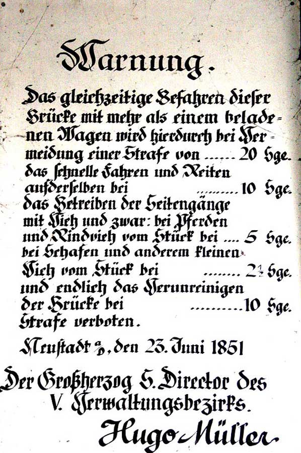 Erste Informationen zur Brücke waren vor Ort schnell gefunden, so ist die Brücke ist 71 Meter lang und 4,30 Meter breit, was einseitiges Befahren zuläßt. Von den gemauerten Fundamenten abgesehen, ist die gesamte Brücke aus Holz gebaut und mit Schindeln eingedeckt. Sie ruht auf 40 bis 50 cm dicken Holzbalken, die im Weidaer Staatsforst geschlagen wurden. Die Brücke gehört architektonisch zu den gedeckten Holzbrücken. Die Bauart ist ähnlich derjenigen der Holzbrücke Hohenfichte, die aus dem Jahre 1832 stammt.