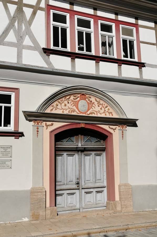Dies ist einzigartig in der Region Nordthüringen. Für Fachwerkkenner interessant ist ein Palmettenstab zwischen den abgeschlagenen Balkenköpfen und darüber ein durchlaufender Eierstab mit Relief. Das Fachwerk wurde 1993 freigelegt.