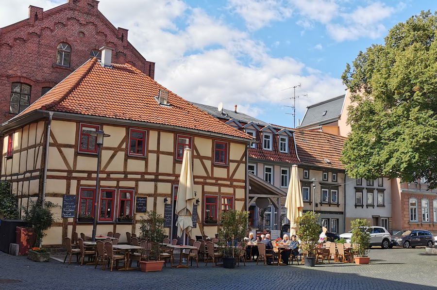 Immerhin 11 mittelalterliche Kirchen und ein gut erhaltener Innerer Stadtmauerring mit zahlreichen Wehrtürmen, ermöglichen uns auch das turmgeschmückte Mühlhausen der Neuzeit zu erleben. Dabei erwartete uns nicht nur sakrale Räume, sondern auch die einzigartige profane Nutzung der Kirchengebäude, zum Beispiel als Stadtbibliothek, Museum oder Theaterbühne. Die Altstadt Mühlhausens gilt als das zweitgrößte Flächendenkmal in Thüringen, dass aufmerksame Besucher bereits an den roten Straßenschildern erkennen können. Neben der Vielzahl an Kirchen und musealen Einrichtungen, wollten wir uns insbesondere der liebevoll sanierten Fachwerk- sowie Bürgerhäuser annehmen, die es hier in großer Zahl gibt.