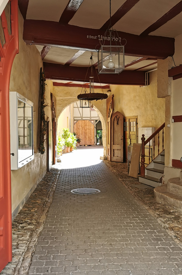 Das Gebäude ist ein liebevoll saniertes Fachwerkhaus in der Einkaufsstraße von Mühlhausen, dem Steinweg.
