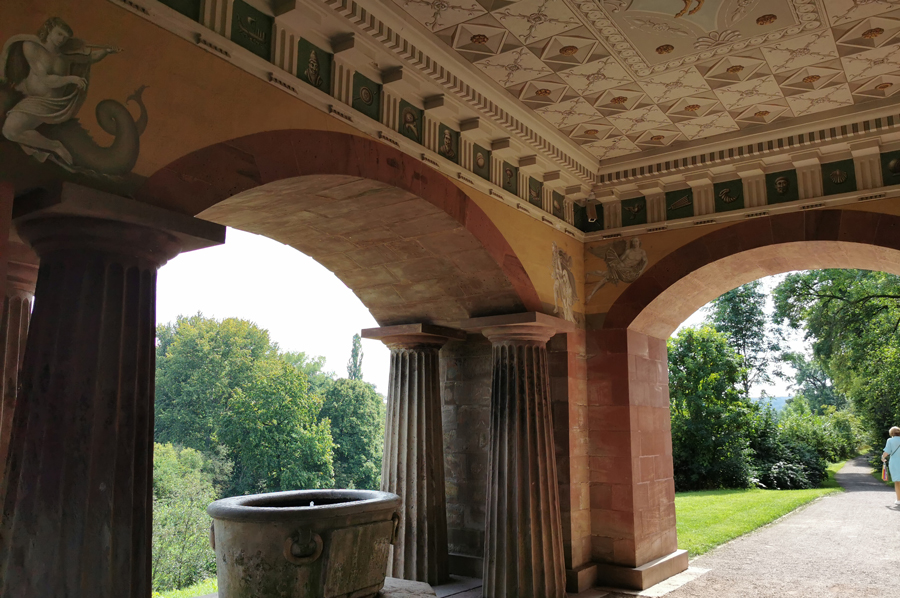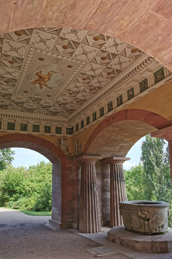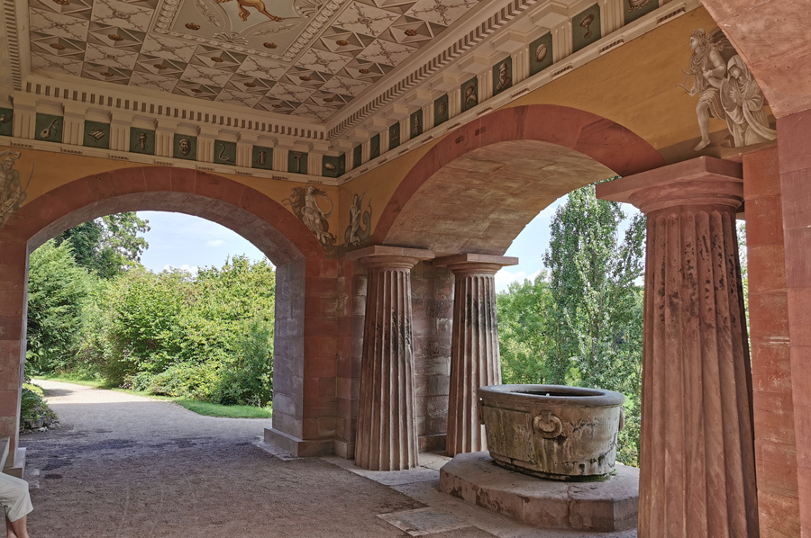 Eine Zeichnung von Friedrich Gilly von 1797/98 zeigt den Durchgang von Süden her unterhalb des Römischen Hauses mit den Dorischen Säulen, dem Brunnen, den wohl Martin Gottlieb Klauer geschaffen hatte. Klauer schuf nicht nur den Wandschmuck außen, sondern auch den im Innenraum. Die Giebelgruppe des Westgiebels, welche ursprünglich von ihm nach einem Entwurf von Heinrich Meyer geschaffen worden war, wurde 1819 durch eine von Peter Kaufmann ersetzt.