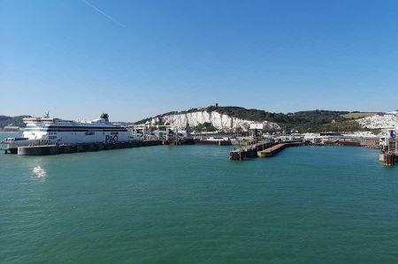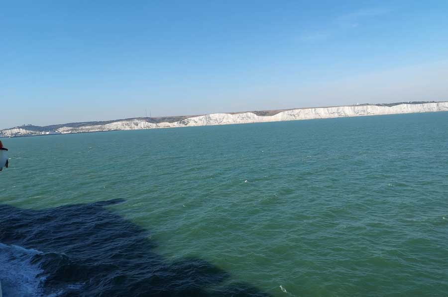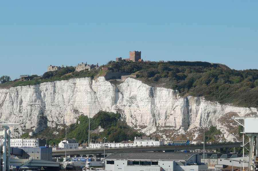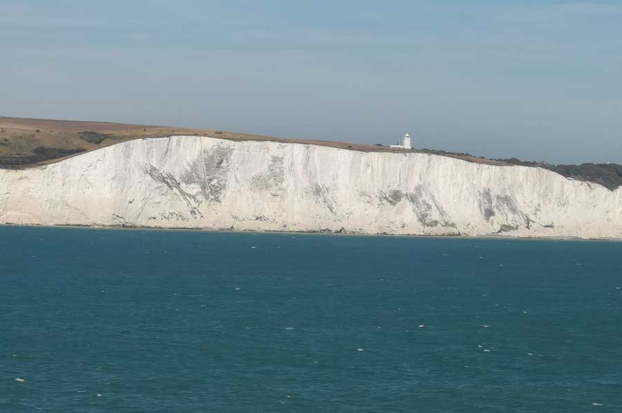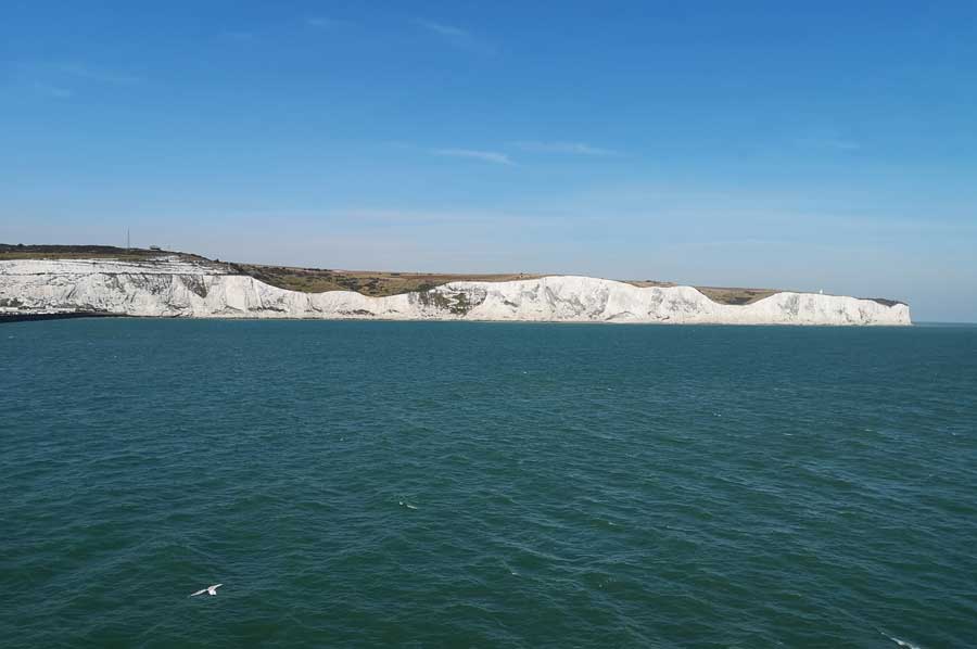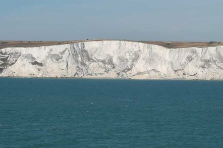 Ganz in der Ferne waren mittlerweile die Kreidefelsen in Sicht gekommen, womit auch die Zahl der Schaulustigen an Deck zunahm. Die Kreidefelsen von Dover, im englischen White Cliffs of Dover genannt, sind tatsächlich hellweiße Klippen, die als Teil des North-Downs-Hügelzuges einen Teil der britischen Küstenlinie bilden. Die bis zu 106 Meter hohe Front der Klippen verdankt ihr Erscheinungsbild ihrer Zusammensetzung aus Kalk (purem weißem Kalziumkarbonat), durchsetzt mit schwarzem Feuerstein.