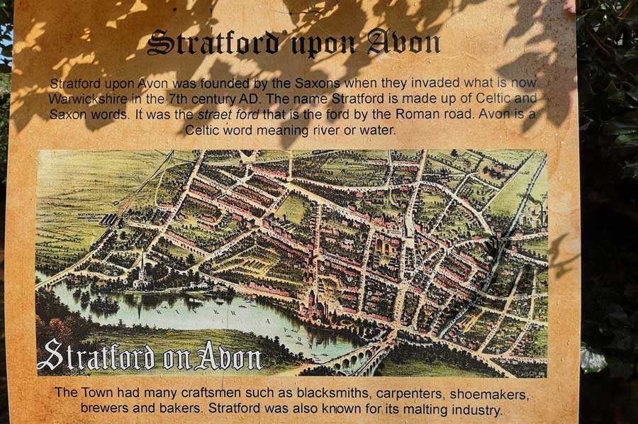Schon damals hatten wir gelernt, dass der Name Stratford-upon-Avon eine Kombination aus dem altenglischen straefordt und dem lateinischen stratum in der Bedeutung "Straße", besser Furt, war, was auf den flachen Teil eines Flusses oder Baches hindeutet, der zu Fuß oder mit dem Karren durchquert werden kann. Avon ist das keltische Wort für Fluss. Diese Furt oder Straße war einst Teil einer römischen Straße, die die Icknield Street in Alcester mit dem Fosse Way verbunden hat. Die Furt, die somit seit der Römerzeit als Kreuzung diente, wurde später zum Standort der Clopton Bridge. Eine historisch belegte Umfrage von 1251 bis 1252 verwendet zum ersten Mal den Namen Stratford, um Old Stratford und die neueren Herrenhäuser zu identifizieren. Der Name Stratford-upon-Avon wurde nach dieser Zeit immer verwendet, um das Gebiet speziell um die Dreifaltigkeitskirche und die Straße der Altstadt zu beschreiben.