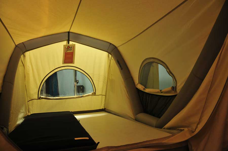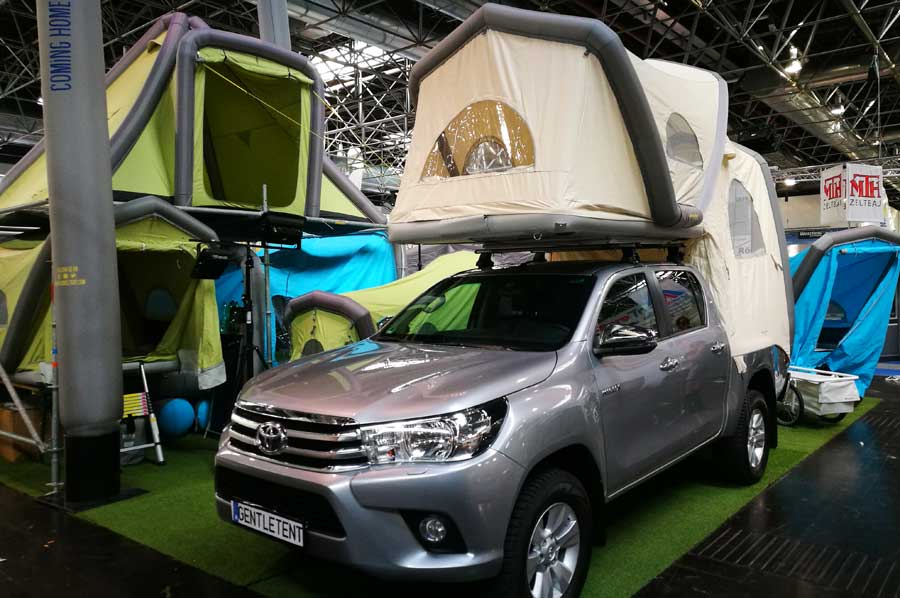 Und wir sollten nicht enttäuscht werden! Schon von weitem war der Pick-up mit dem sandfarbenem Zeltaufbau zu sehen, so großräumig der Zeltaufbau. Wobei sich das Grundkonzept des B-Turtle´s und des Roof auch hier wieder fand, eine 2,20 mal 1,40 Meter große Drop-Stitch-Matte als Basis, daran ansetzend der konstruktive Luftschlauch für das Schlafzelt auf der Basis eines Aluminiumprofils, das zur Befestigung auf dem Dachträgersystem genutzt wird. Soweit so gut und bekannt. Neu und wirklich gelungen ist der Ansatz und Übergang zur Ladefläche des Pick-up, wodurch sich ein großes Vorzelt ergibt, das zur Aufnahme einer Kompakt-Küche oder auch von Sitzmöbeln eignet. Entsprechend groß das Interesse der Messebesucher. Wir werden darüber getrennt berichten.