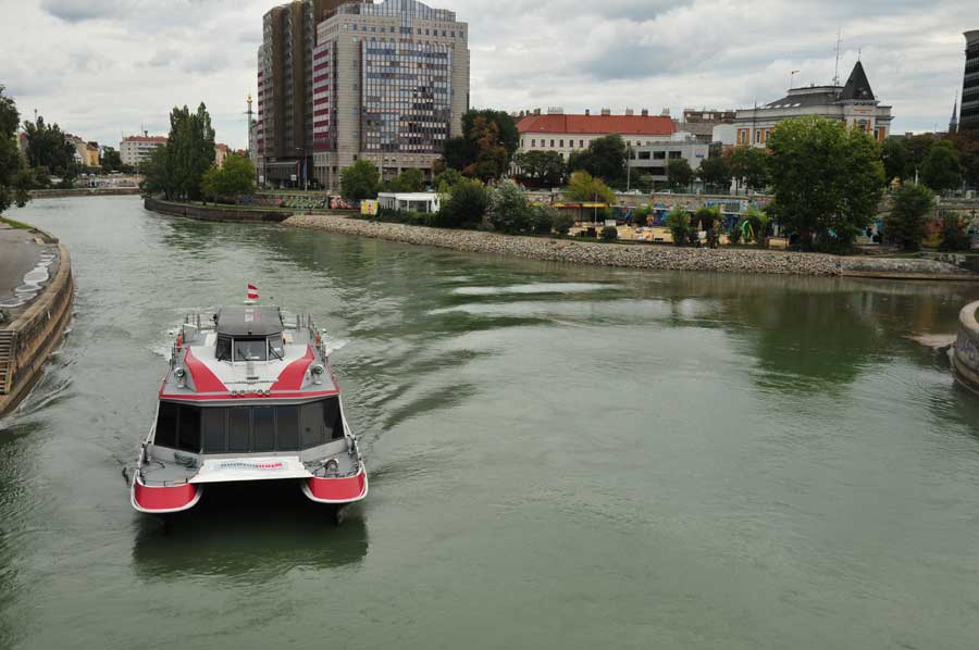 Noch schnell etwas Proviant eingepackt, dazu eine Regenjacke (zur Sicherheit, bei dem leider bewölkten Probetag) und die Erprobungstour konnte beginnen, Zielort zunächst der Campingplatz Neue Donau auf der Donau Insel. Zunächst entlang des Wilhelmsdorfer Parks in die Längenfeldgasse ging es überwiegend leicht bergab bis zum Wien Fluss. Wenn nicht komplett abgetrennte Radwege zur Verfügung stehen, gibt es zumindest Radspuren an fast allen Straßen, so dass trotz des hohen Verkehrsaufkommens sicheres Fahren durch die Stadt möglich wird.