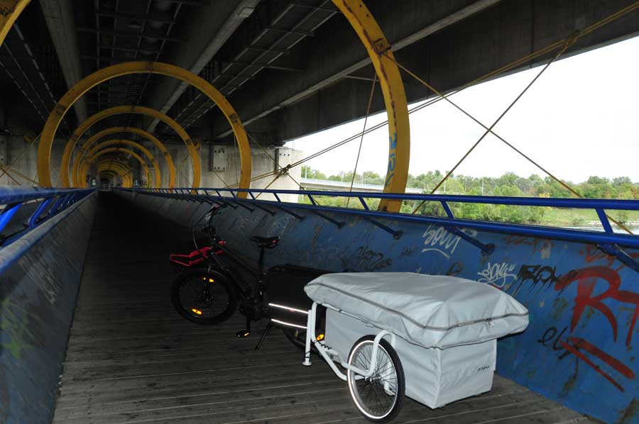 Es gibt für absolut stark ansteigendes Gelände auch die Möglichkeit der Unterstützung des E-Motors im Gehen, was sich später bei einer zu ersteigenden Brücke als große Hilfe zeigen sollte. Die Verbindung von E-Bike und B TURTLE wird übrigens durch die Langzeit erprobte Weberkupplung hergestellt, deren Achsgelenk auf die hintere Fahrradachse aufgesetzt und verschraubt wird. Im Fall des Benno-Bikes musste lediglich eine etwas längere Achsschraube eingesetzt werden. Wichtig für Gäste, die gern mit dem eigenen Fahrrad zur Erkundungstour aufbrechen möchten. Die Kupplungsachse vom B TURTLE wird dann durch Drehen auf die am Rad befestigte Kupplung gesteckt und schon ist das Gespann startklar. Natürlich wollten wir auch die tatsächliche Reichweite testen, weshalb wir uns zunächst immer auf die Fahrstufe Eco einstellten, sprich kleinste Unterstützung, was auch ohne große Anstrengung etwa 21 km/h als mittlere Geschwindigkeit erlaubte.