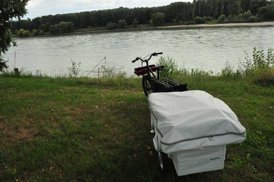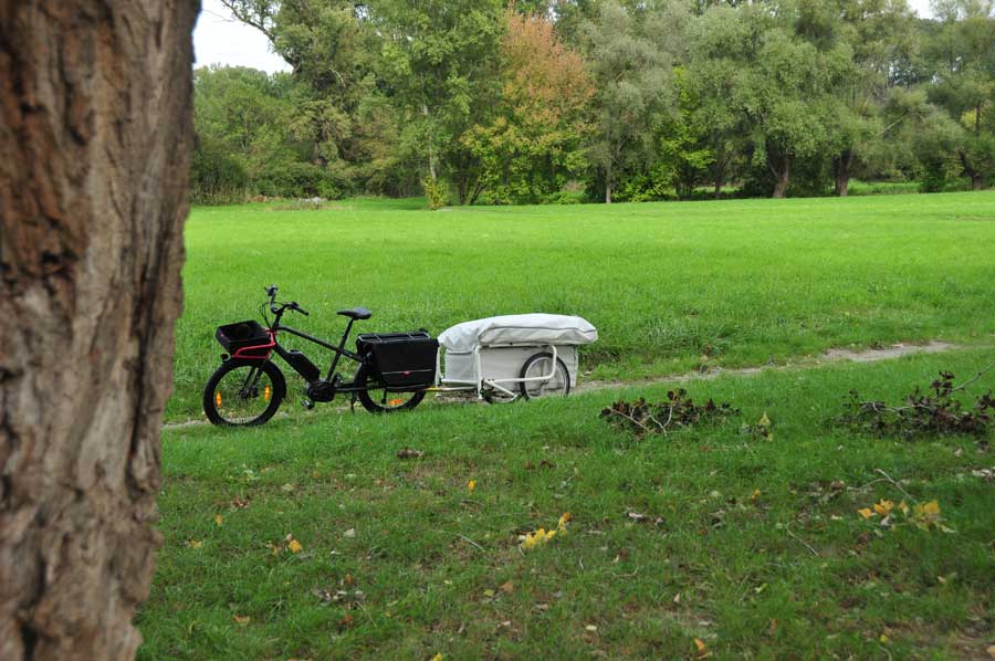 Zurück zur Donau folgen wir dem Radweg entlang des Flusses durch Lobau mit seinen riesigen Ölanlagen, gelangen dann in den Nationalpark Donau Auen. Gegenüber der antik römischen Stadt Carnuntum überqueren wir die Donau Bedeichung, fahren entlang recht sandiger Feldwege, wo wir dankbar für die recht griffigen Reifen auch die Geländegängigkeit von Rad und BTURTLE testen können. Das Ergebnis ist mehr als nur befriedigend. Weder Schotter noch tiefer Sand konnten den Vortrieb beschränken.