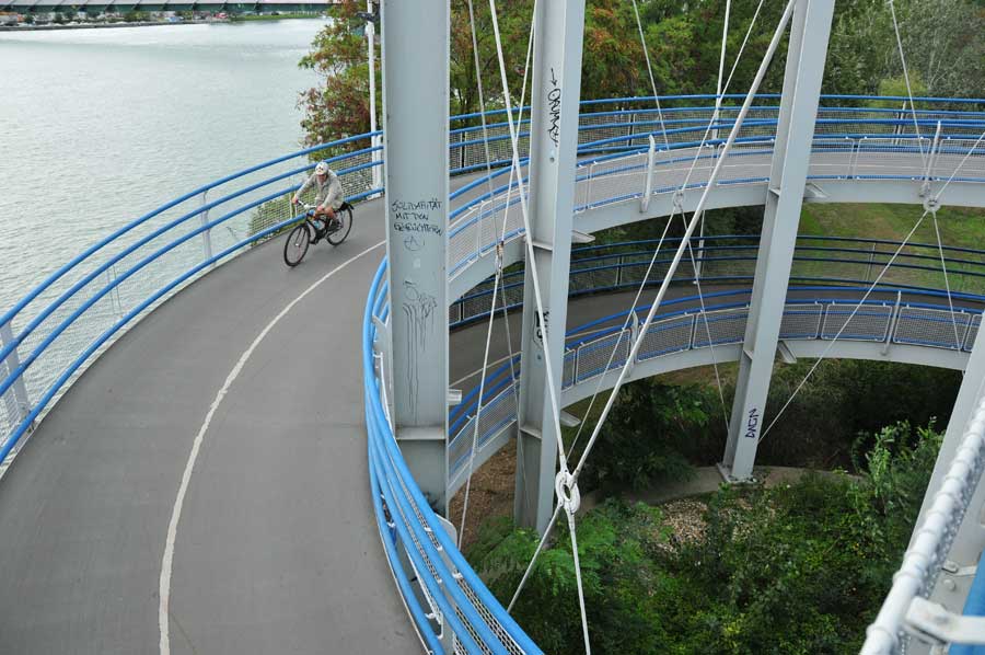 Wir haben das Ufer der Donau erreicht und überqueren sie unterhalb der Autobahnbrücke der A 23, übrigens beidseitig mit befahrbaren Radliften ausgestattet, wo wir erstmals die Vortriebsstufe der Motorsteuerung von Eco auf Sport änderten, um mehr Vortriebsunterstützung zu erhalten. Ein Stück noch auf dem hier entlang verlaufenden Donau-Radweg, hinüber zum Campingplatz Neue Donau, der sich als Übernachtungscampingplatz am Donau-Radweg geradezu auch zur Wien-Erkundung anbietet.