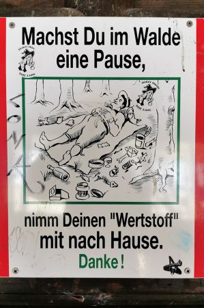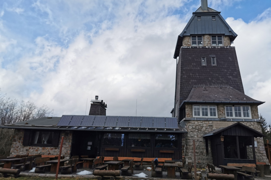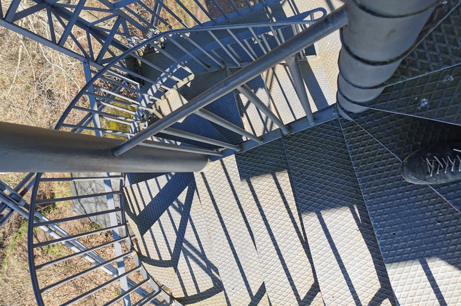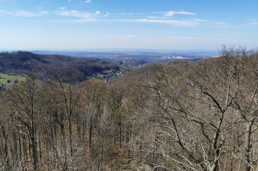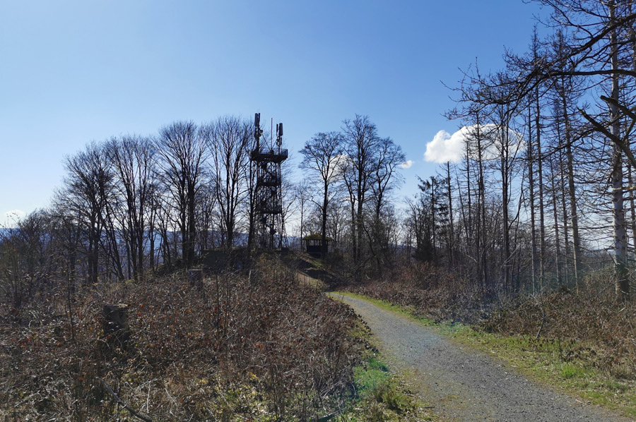Wie bereits erwähnt, wollen wir den Rückweg über Wald- und Forstwege versuchen, trotz des Wissens, dass es überwiegend bergauf geht und wir diese Route noch nicht erkundet haben. So führt uns die Navigation zunächst zur Göttinger Hütte und dann zur Scharzfelder Hütte, überwiegend parallel zum Verlauf der Bremke. Wenig später erreichen wir den Großen Knollen, der am Harzer Baudensteig liegt und ist als Nr. 150 in das System der Stempelstellen der Harzer Wandernadel einbezogen ist. Wir entschließen uns für eine kleine Rast, auch um Näheres zum Aussichtsturm „Knollenturm“ zu erfahren.