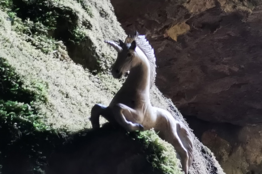 Die ebenfalls sagenumwobene Höhle „Einhornhöhle“ hat eine Länge von fast 700 Metern, von denen etwa 300 Meter bei den etwa zweistündig stattfindenden Führungen gezeigt werden. Laut neueren Untersuchungen und Angaben unseres Höhlenführers durch Georadarmessungen und Bohrungen ist die Höhle weitaus länger als die bisher bekannten und zu besichtigenden Teile. In der Höhle reihen sich mehrere Hallen und Dome aneinander, die durch niedrigere Gänge miteinander verbunden sind, was zu spannenden Erläuterungen des Höhlenführers bei den Haltepunkten führt. Der Hohlraum der Höhle ist bis zu 50 Meter hoch, allerdings größtenteils mit Sedimenten einer Mächtigkeit zwischen 15 und 30 Meter verfüllt, wie uns plausibel erläutert wird. Die Sedimente gelangten überwiegend während der Eiszeiten auf natürliche Weise in die Höhle.