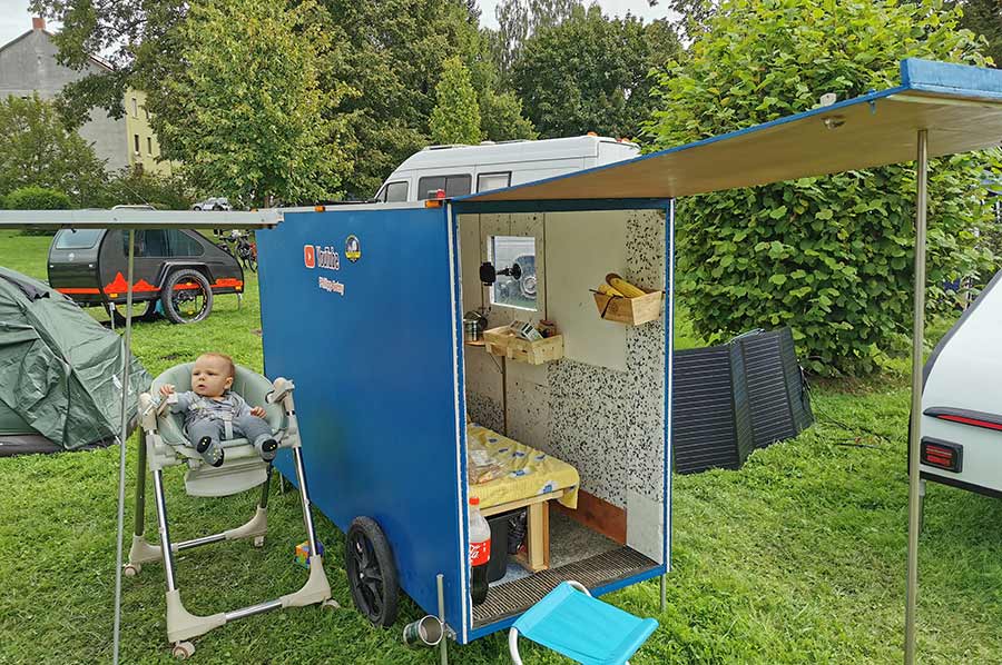 Der Slogan von Jörg und Marco soll an dieser Stelle ja auch nicht umsonst gewählt sein, denn mit „Wir wollen uns jedes Jahr verbessern“, sind schon die Ziele hochgesteckt. So war denn auch die Festwiese in Luckenau schnell gefunden, die verständlicherweise für die Fahrradwohnwägen und ihren Anhang bzw. ihre Zugfahrzeuge vorbehalten war. Und bei unserer Ankunft am Freitag war die Festwiese schon gut mit Fahrradwohnwägen gefüllt, so das wir schon fast die Suche nach der eigenen Campingzone aufgegeben hatten. Kein Grund zur Panik, so Jörg, hatte er doch mit einigen anliegenden Grundstückseigner vorgesorgt und so konnten auch wir unseren PKW mit Dachzelt auf einem Privatgelände abstellen und aufbauen. Einmal mehr zeigte sich dabei auch unsere Kompaktküche von ihrer besten Seite, denn schnell war ein erster Tee sprich auch Kaffee angesetzt.