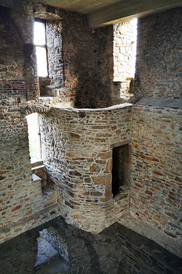 Im ersten Stockwerk sind aber die Reste des achtteiligen Kreuzrippengewölbes sichtbar, ebenso wie in allen Geschossen – außer im ehemaligen Verlies – noch Reste von Kaminen sichtbar sind. Eine moderne Wendeltreppe im Turminneren führt zu einer Aussichtsplattform, die über 88 Stufen zu erreichen ist.