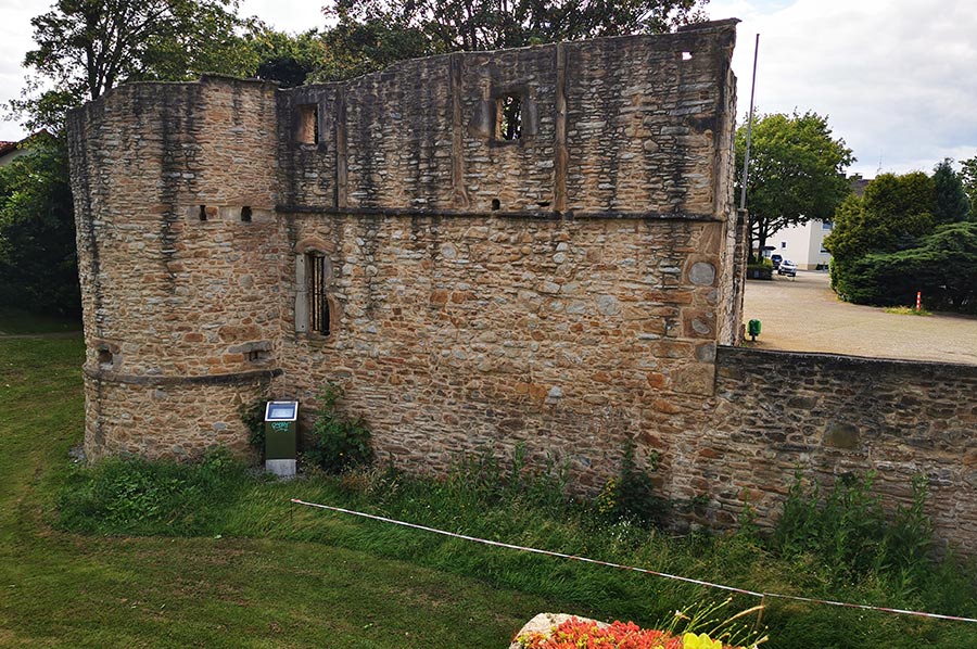 Die Straße ist mit Tempo 30 Schildern bestückt, so dass man sich als Radfahrer recht sicher fühlen kann. Kurz vor dem Ziel führt entlang der Schule ein Radweg bis in das Ortszentrum. Schon hier ist die Burgruine gut auszumachen.
