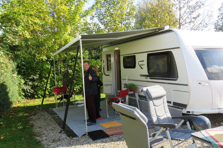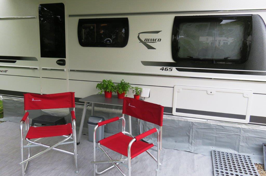 Unser Stellplatz lag für die Besucher günstig, direkt hinter der Schranke, vor dem Bade- und Saunaparadies. Auch vor dem Caravan hatten wir mit den Isabella-Produkten einen Volltreffer gelandet. Die Windblende wird für Fendt-Caravans passend geliefert, Vorzeltteppich, 6 Stühle und 2 Tische sorgten für ein freundliches und einladendes Bild. Die Stühle waren sehr begehrt, denn der Bianco Activ war ständig „überfüllt“ und so konnten sich unsere Besucher gut verteilen.