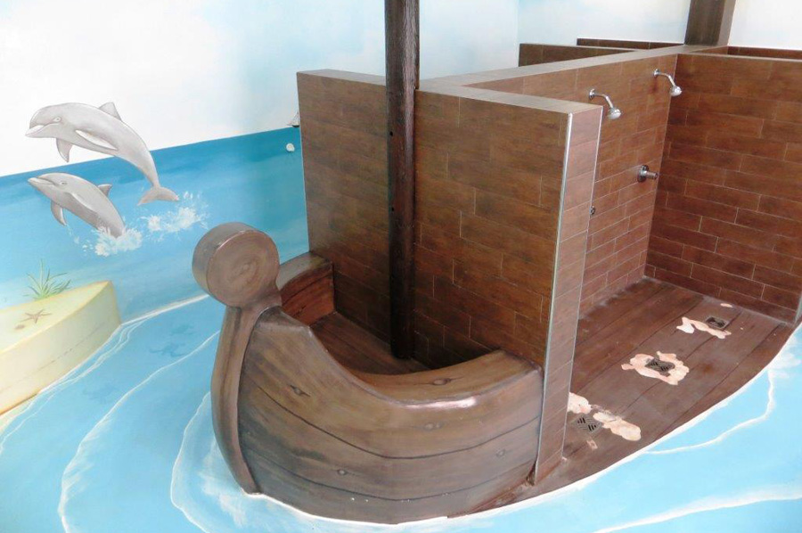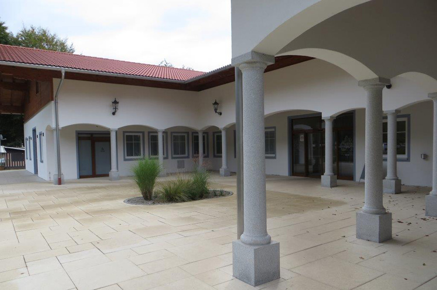 Wer sich das neue Waschhaus von allen Seiten anschaut, wird neue Dimensionen erkennen. Der Bau ist ein Mittelding aus einem oberbayrischen Dreiseithof und einer römischen Villa mit Arkaden. Alles ist großzügig geplant und der Eingangsbereich ist zusätzlich auch noch richtig schön geworden. Gleiches gilt auch z.B. für die sehr großen Duschen mit ihren großen Waschbecken, die einem privaten Badezimmer in nichts nachstehen.